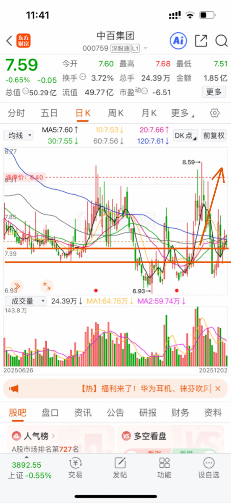 $中百集团(SZ000759)$ 算是站稳了,方向看涨,但收盘价最好站在20天均线上方。