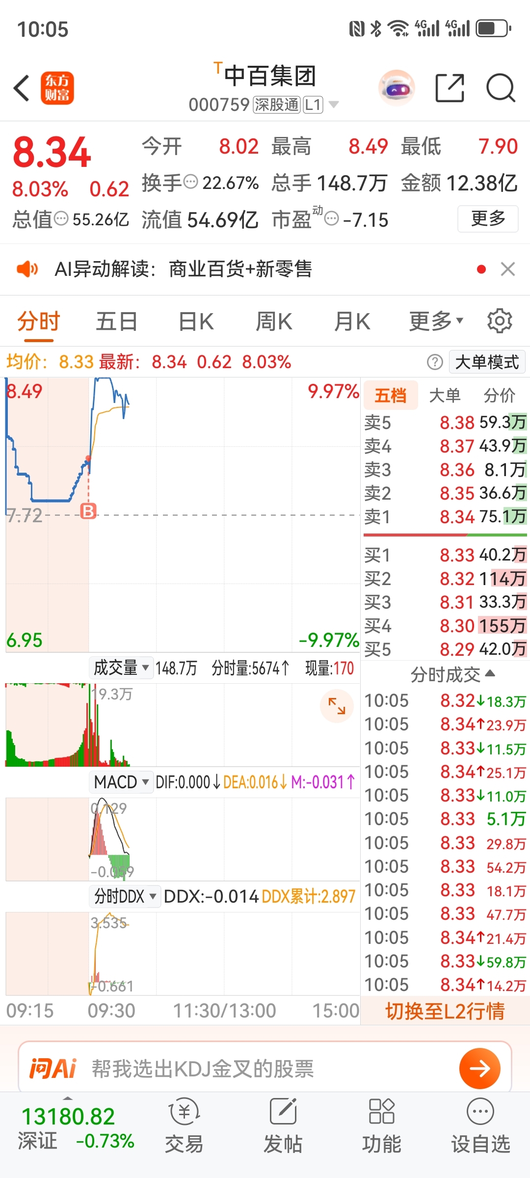 $中百集团(SZ000759)$ 炸板就炸板吧,回落也无所谓,反正我是竞价买的,我的成本很低,大不了明天比谁跑得快。今天最强的板块就是消费。我的操作没有问题,猛干消费主线就行了,前排东百集团。永辉超市,安记食品有人开路,还有持续性的。