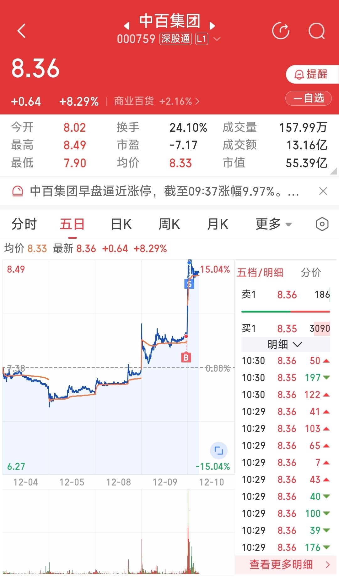 $中百集团(SZ000759)$ 感谢老天爷,前天涨停进的永辉,昨天一早上涨停走了,下午在想进永辉进不去,排队快一个小时都进不去,后来快收盘,进了中百,虽然买在了当天最高点,而且已经涨了几天,今天很有可能会亏进去,但是谢谢早上涨停了,虽然今天在永辉没有赚到,但是在中百赚到了,谢谢主力。