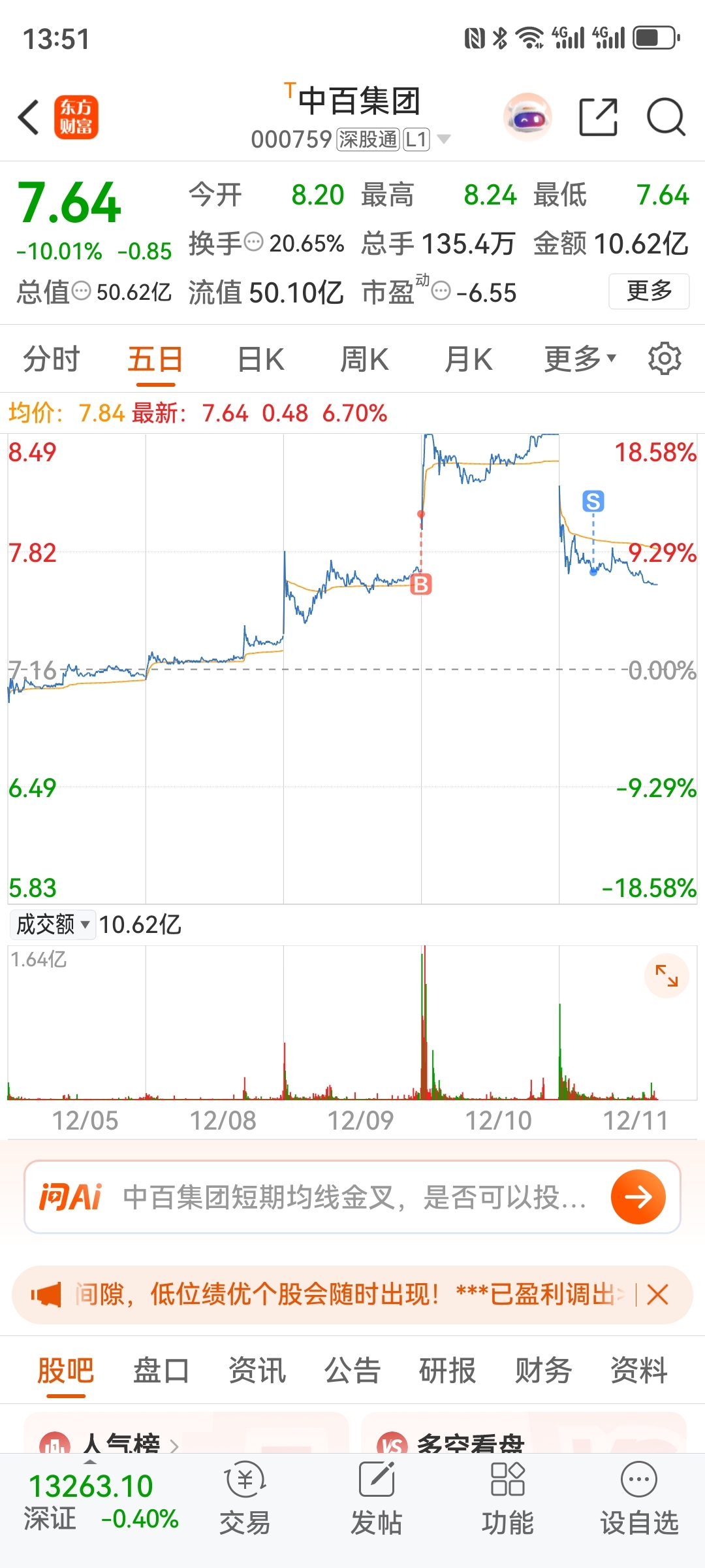 $中百集团(SZ000759)$ 昨天涨停,今天跌停,也是连板了。二连板