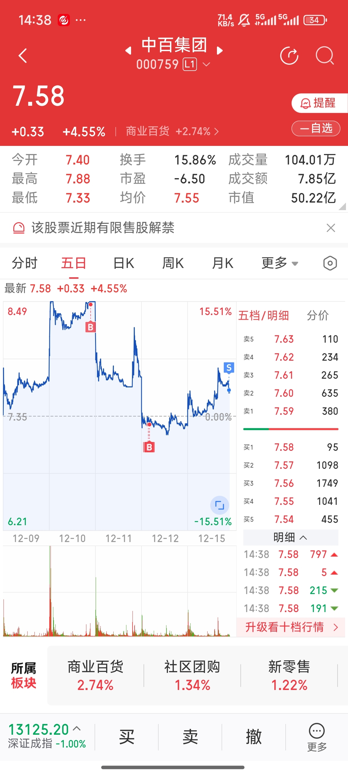 $中百集团(SZ000759)$ 我也全卖出了,太伤心了,打板进给套了,昨天跌6个点加满仓,赚点钱,7.69,770全清仓了,