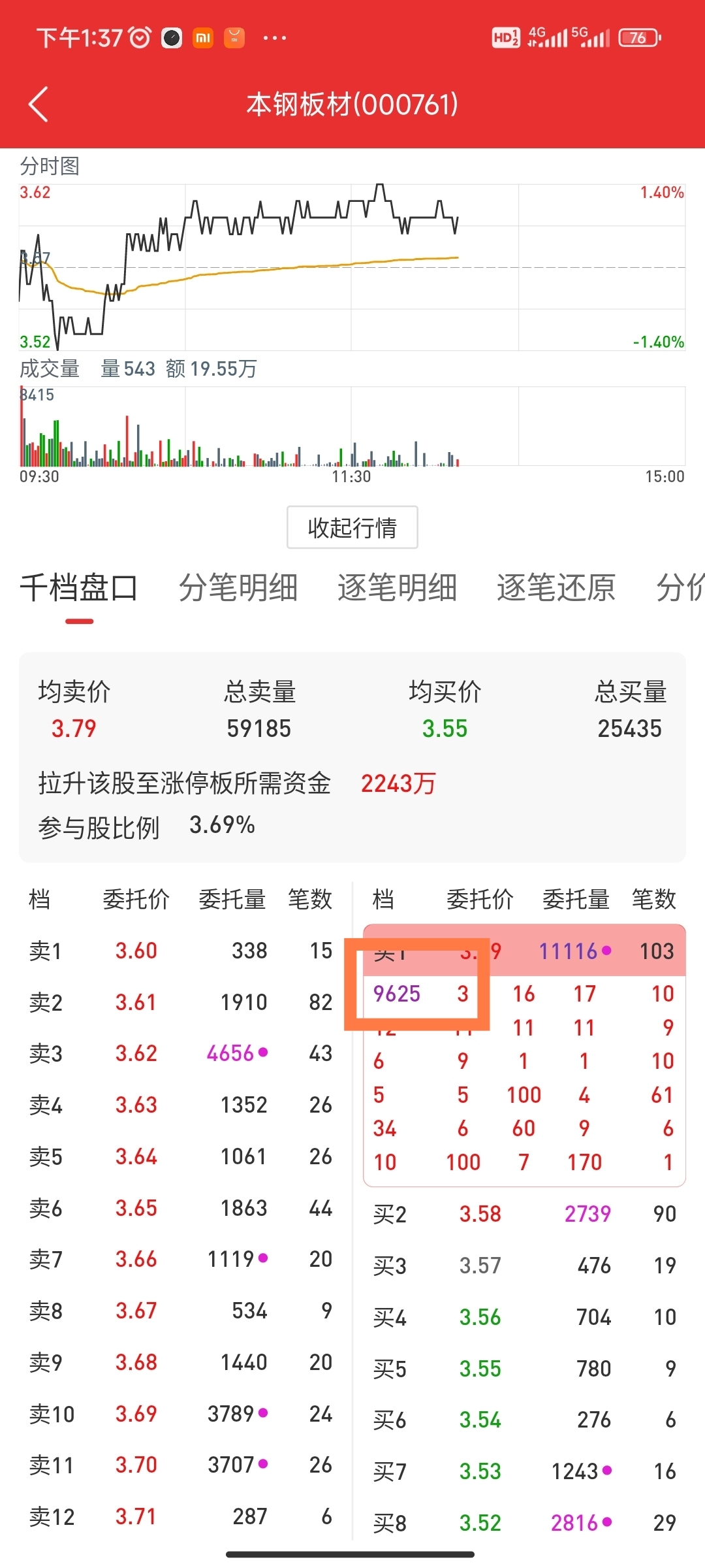 $本钢板材(SZ000761)$ 3.59,哪位大哥的一万手,从早上挂到现在,不知道收盘前能成交完吗?真真切切有零有整的一万手,早上看他挂的。是哪位大哥的,有空私我,聊下。