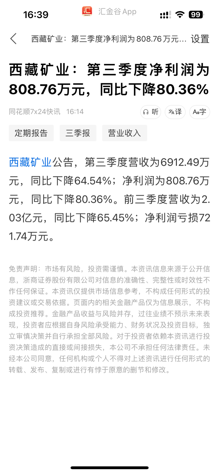 $西藏矿业(SZ000762)$ 第三季度是盈利的,日子总会越过越好的