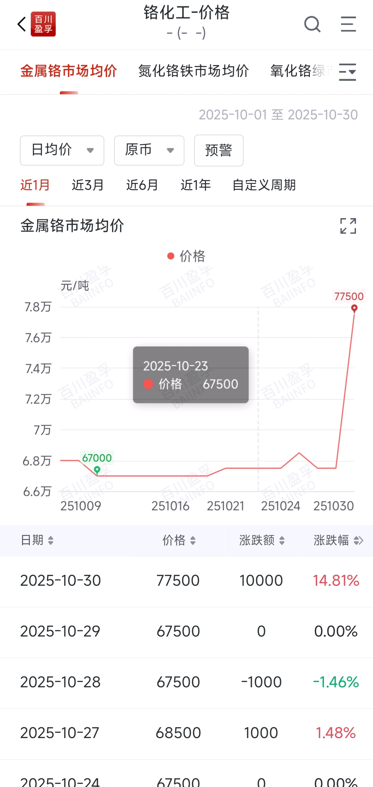 数据来源是bcyf,铬今天一天涨价幅度为14.43%,铬铁对外依存度超过99%,每年进口南非铬铁矿超过80%,叠加南非铬铁出口关税,西矿作为国内唯一拥有铬铁矿产的企业,重要性不必多说。