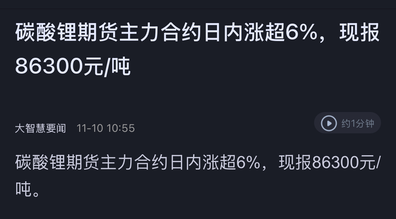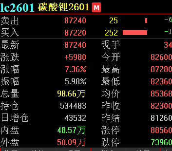 碳酸锂期货主力合约日内涨超6%,现报86300元/吨