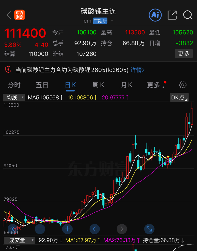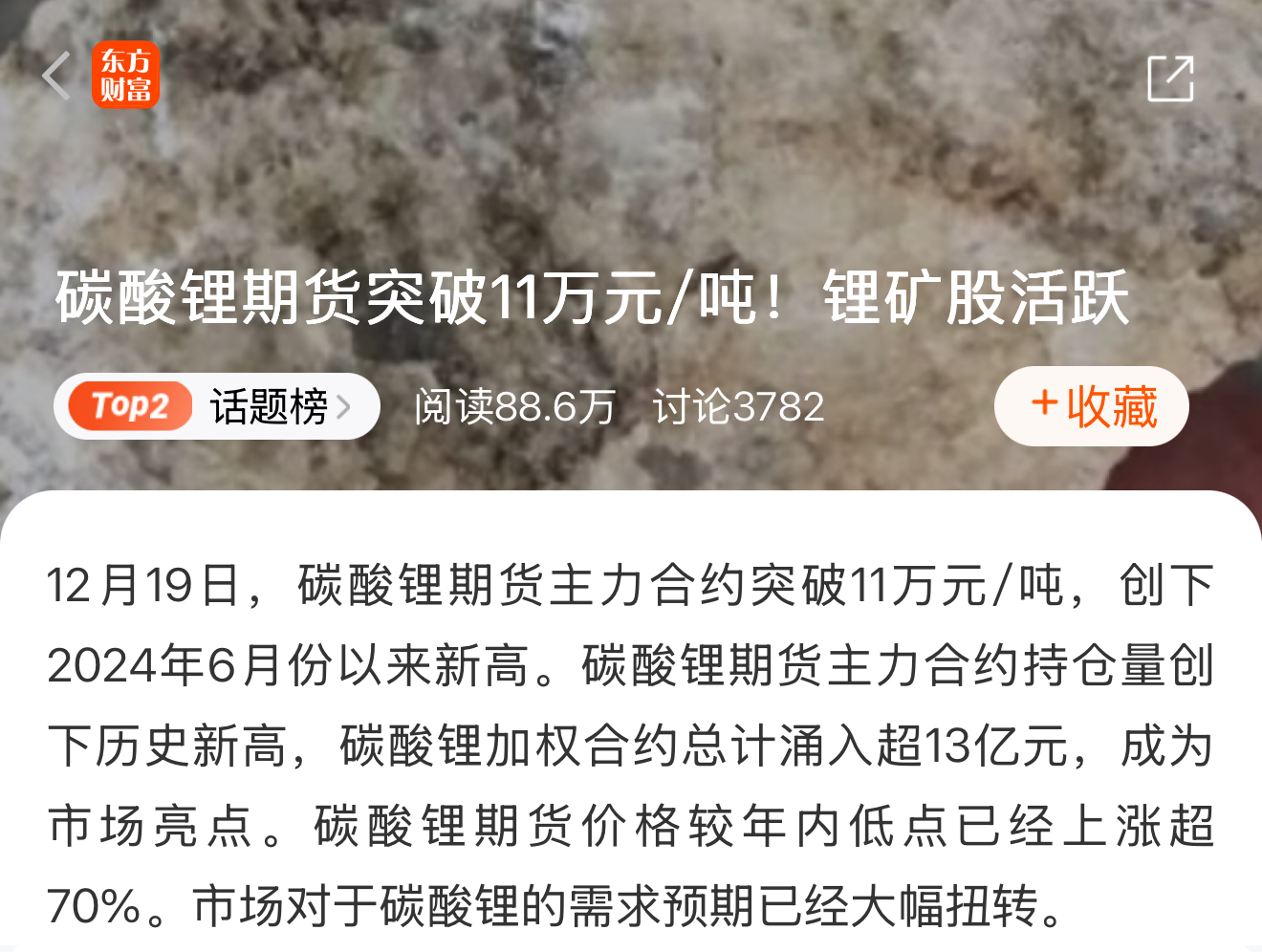 12月19日,碳酸锂期货主力合约突破11万元/吨,创下2024年6月份以来新高