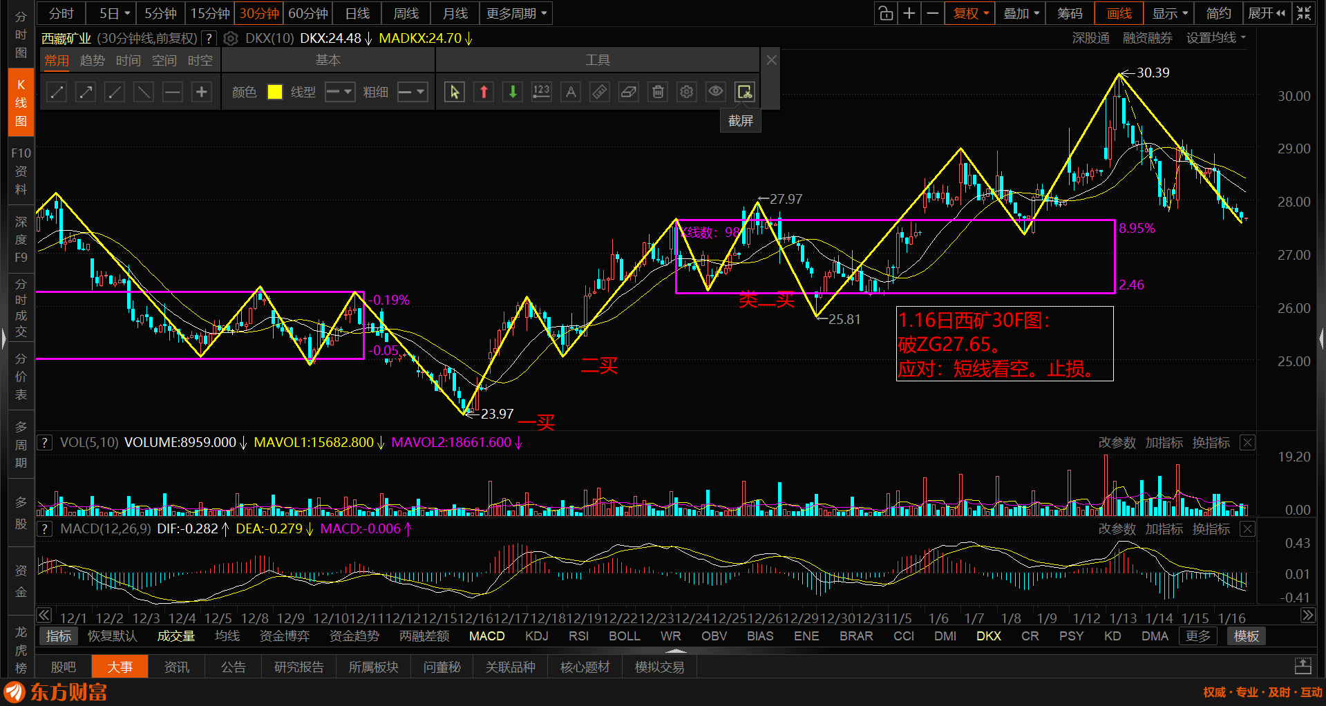 西矿短线破位走势,挥刀止损,认错出局。中矿止盈。