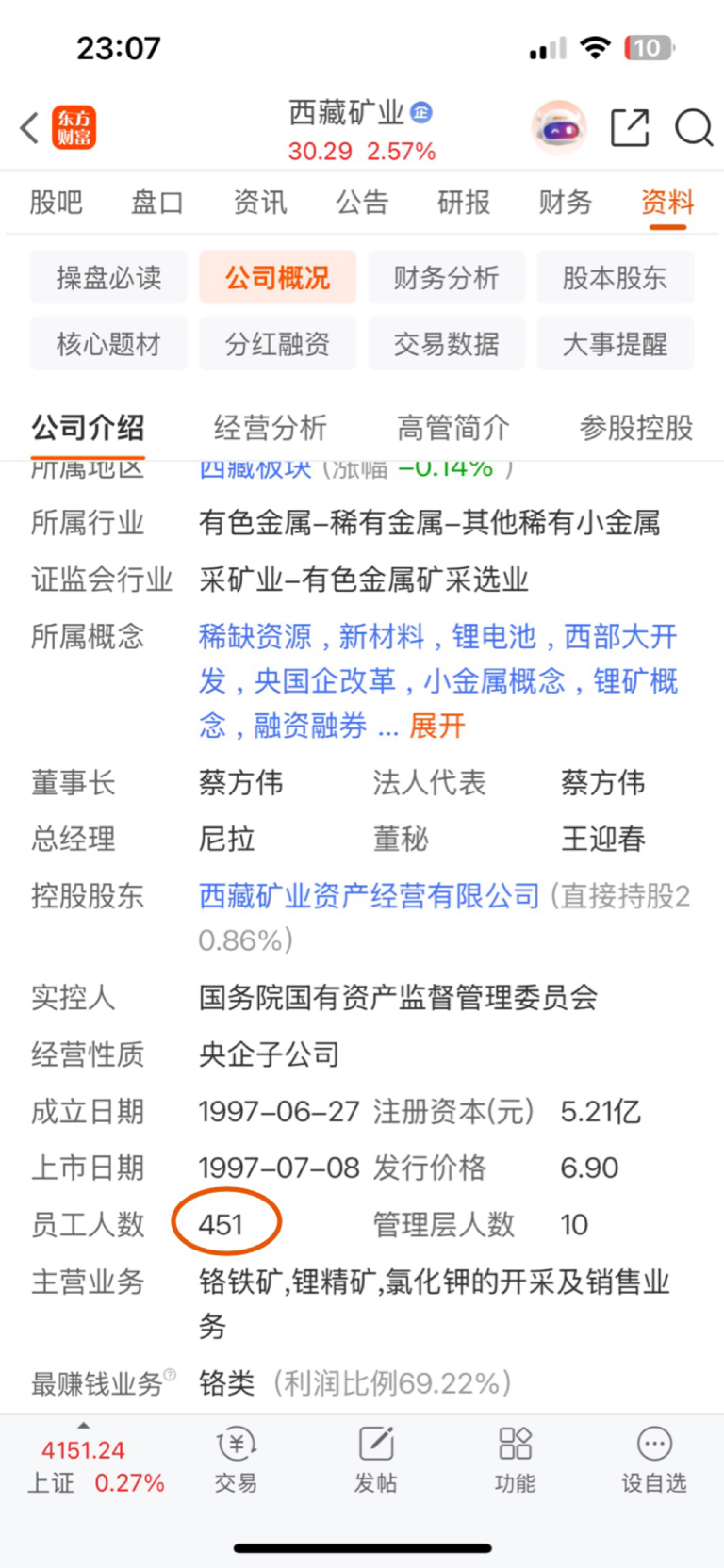 $西藏矿业(SZ000762)$ 不懂就问 为什么他的员工这么少