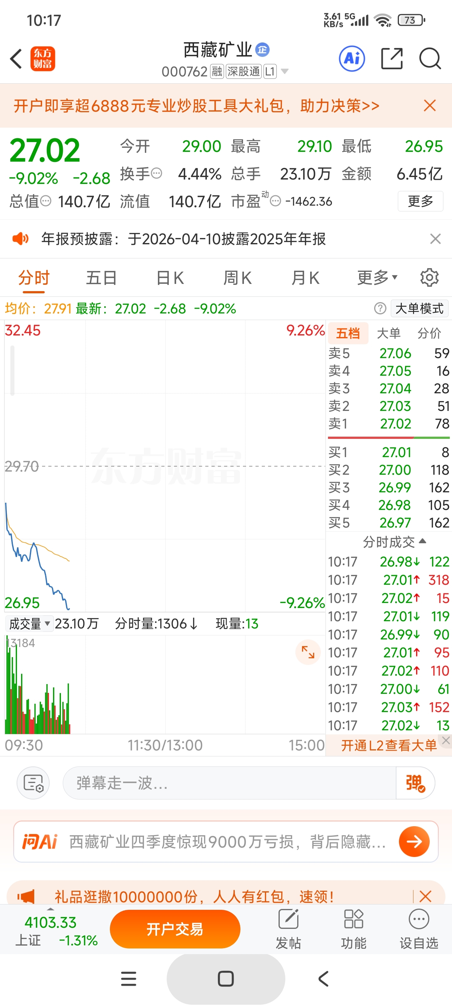 $西藏矿业(SZ000762)$ 要命要跌停,今晚预报肯定差得不行