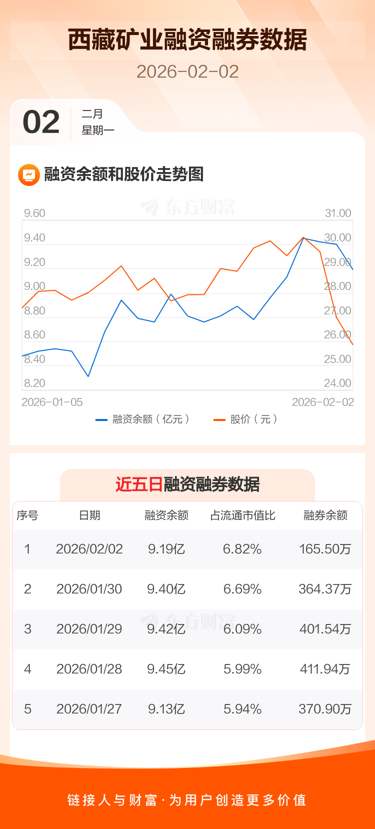 交易所最新数据显示,西藏矿业于2026年2月2日获融资买入5050.86万元,融资偿还7189.25万元,当日融资净偿还2138.38万元。目前,该股融资余额9.19亿,占流通市值比例为6.82%。