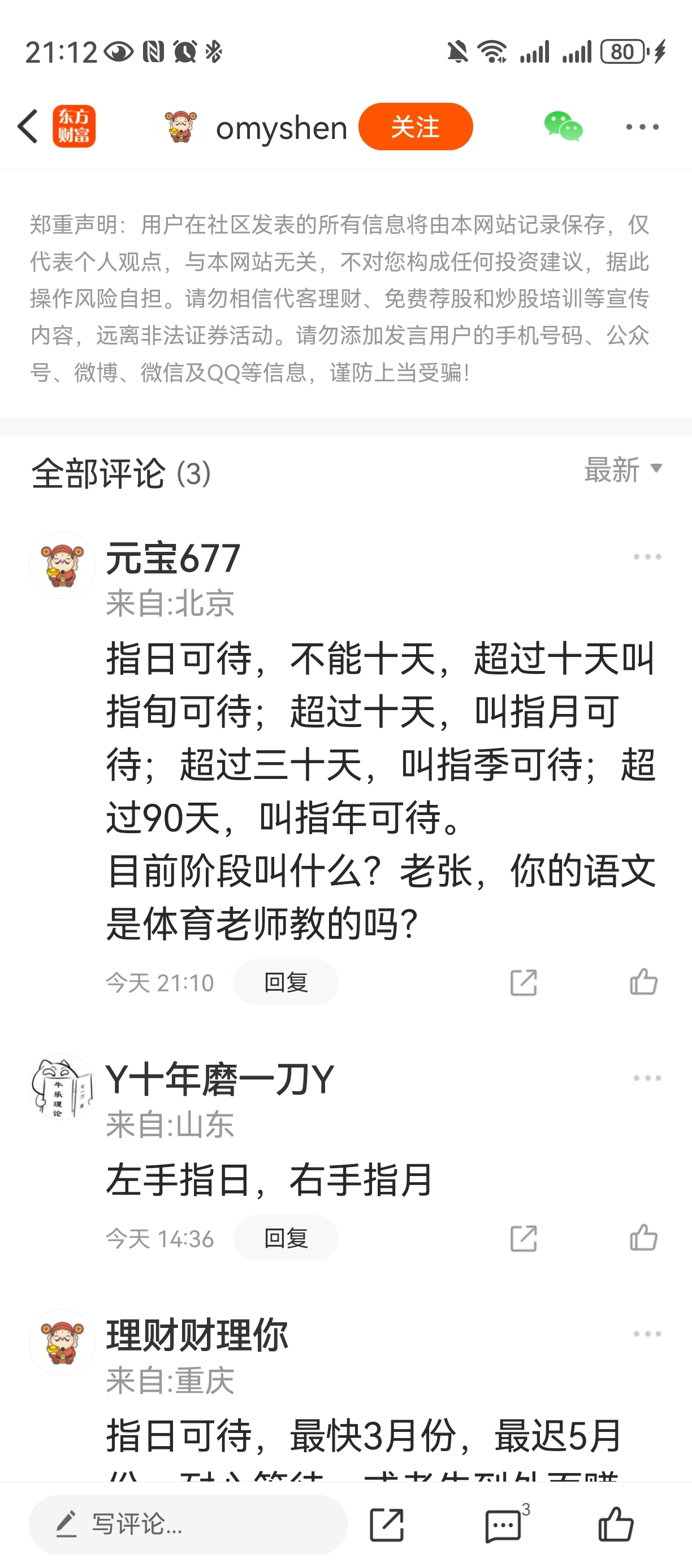 温馨提示: 1.根据《证券法》规定,禁止编造、传播虚假信息或者误导性信息,扰乱证券市场;2.用户在本社区发表的所有资料、言论等仅代表个人观点,与本网站立场无关,不对您构成任何投资建议。用户应基于自己的独立判断,自行决定证券投资并承担相应风险。《东方财富社区管理规定》
