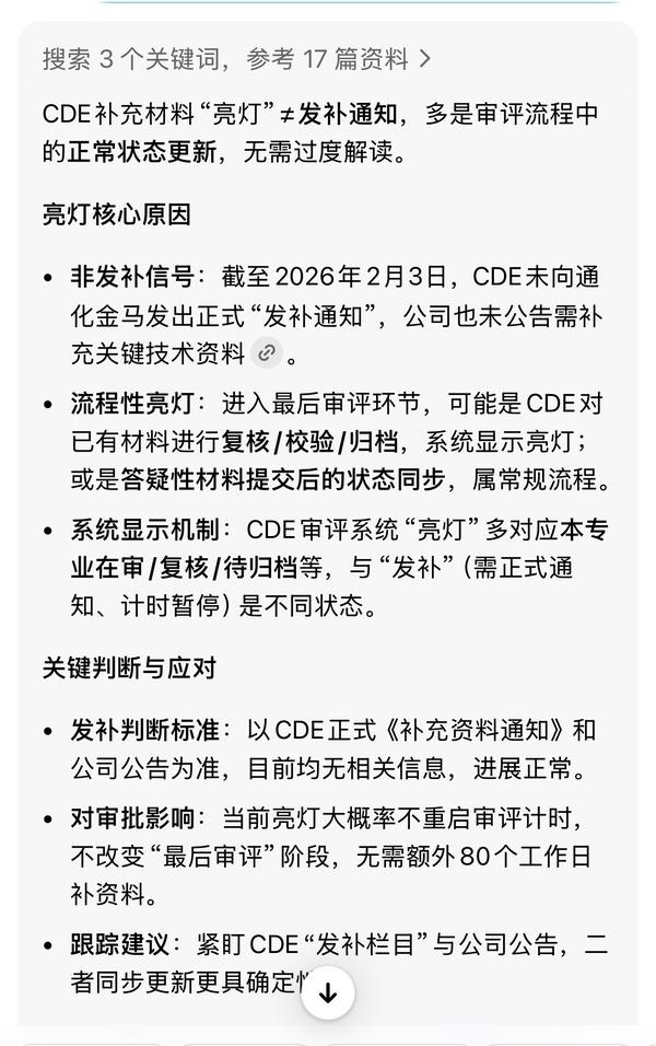 $通化金马(SZ000766)$ 亮灯不等于发补,只有 CDE 发向企业发正式补充资料通知书才算发补!老铁们不要自己吓自己!