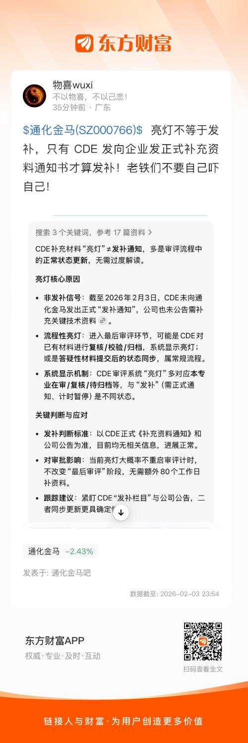 $通化金马(SZ000766)$  亮灯不等于发补,只有 CDE 发向企业发正式补充资料通知书才算发补!老铁们不要自己吓自己!