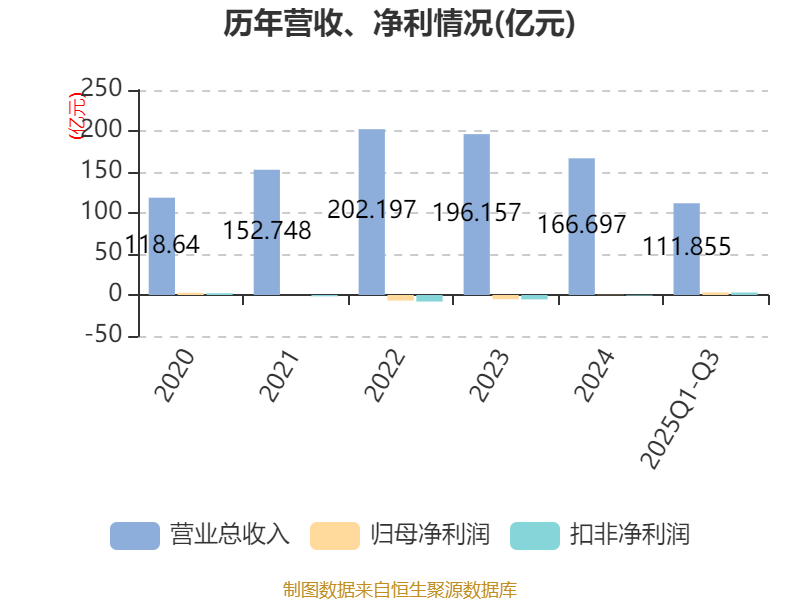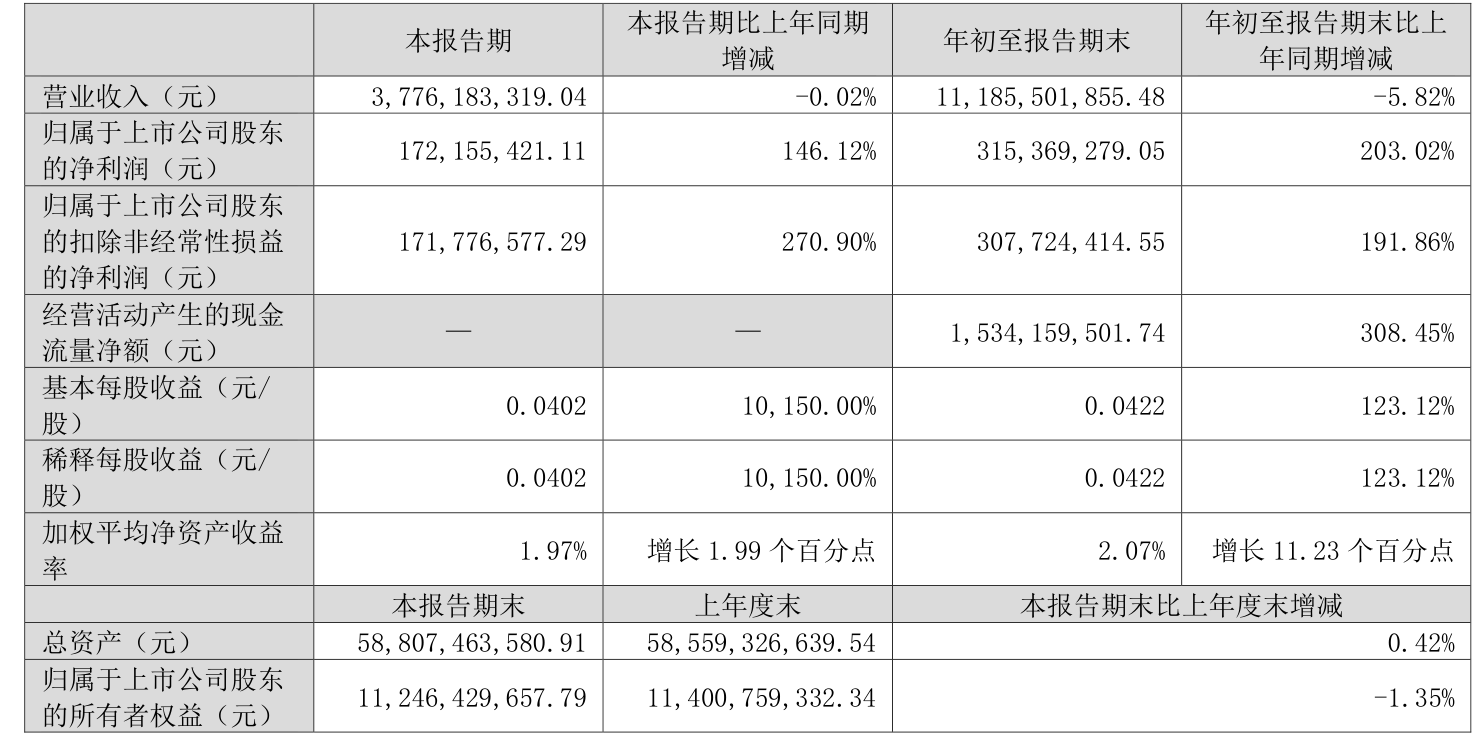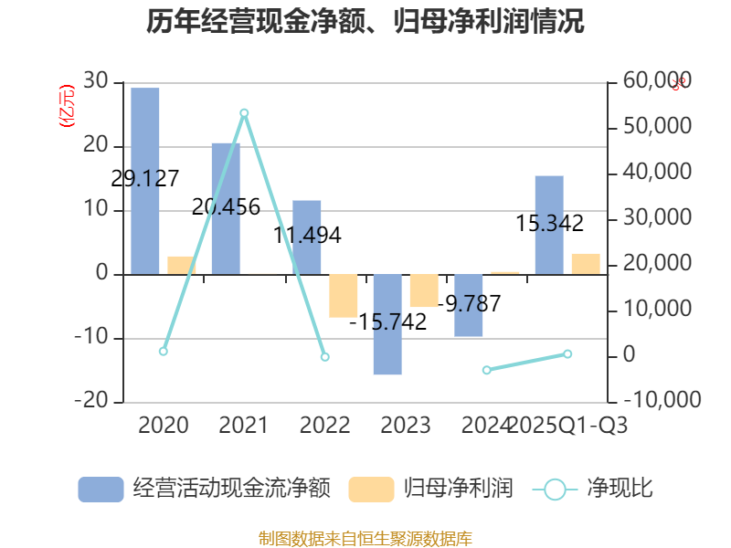 2025年前三季度,公司经营活动现金流净额为15.34亿元,同比增加22.7亿元;筹资活动现金流净额22.59亿元,同比增加6.71亿元;投资活动现金流净额-19.46亿元,上年同期为-18.3亿元。