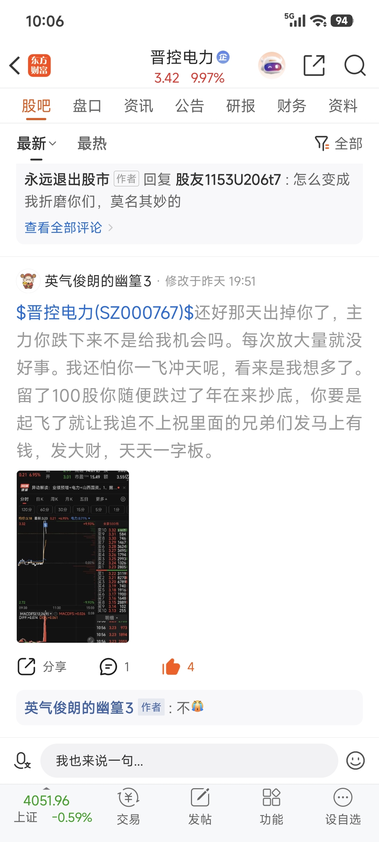 $晋控电力(SZ000767)$ 不是主力你是看股吧的,我昨天才说完你就这样对我。我就留了一百股我还没上车呢,不要啊不要啊