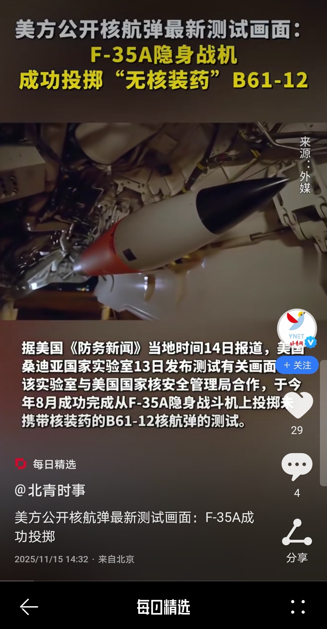 $中航西飞(SZ000768)$ 北青时事转美国《防务新闻》报道,美国桑迪亚国家实验室发布测试画面该实验室与美国核安全管理局合作,于今年8月成功完成从 F -35A隐身战斗机上投掷携带核装药的B61-12核航弹的测试。