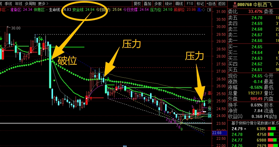 $中航西飞(SZ000768)$ 中期趋势走弱了,前期高位回落跌破了安全线,没有能马上拉回站稳,就形成了跌破趋势,当时就得大幅减仓应对,不然接下来都是连绵不绝的回落,很被动。每次反抽起来都是安全线变成了压力位,短线这里小反弹后再次碰到了安全线24.94位置,接下来就看能否拉起来站稳,站稳就还能看,站不稳就要高抛控制仓位处理比较合适,反正这里不能重仓。#炒股日记# #收盘点评#