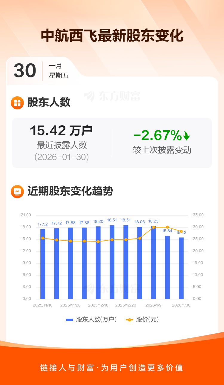 中航西飞最新披露数据显示,截至1月30日公司股东户数为15.42万户,较上期(2026年1月20日)减少4225户,降幅为2.67%。户均持有流通股数量由上期的1.75万股上升至1.80万股,户均持股金额由上期的52.55万元减少至50.81万元。