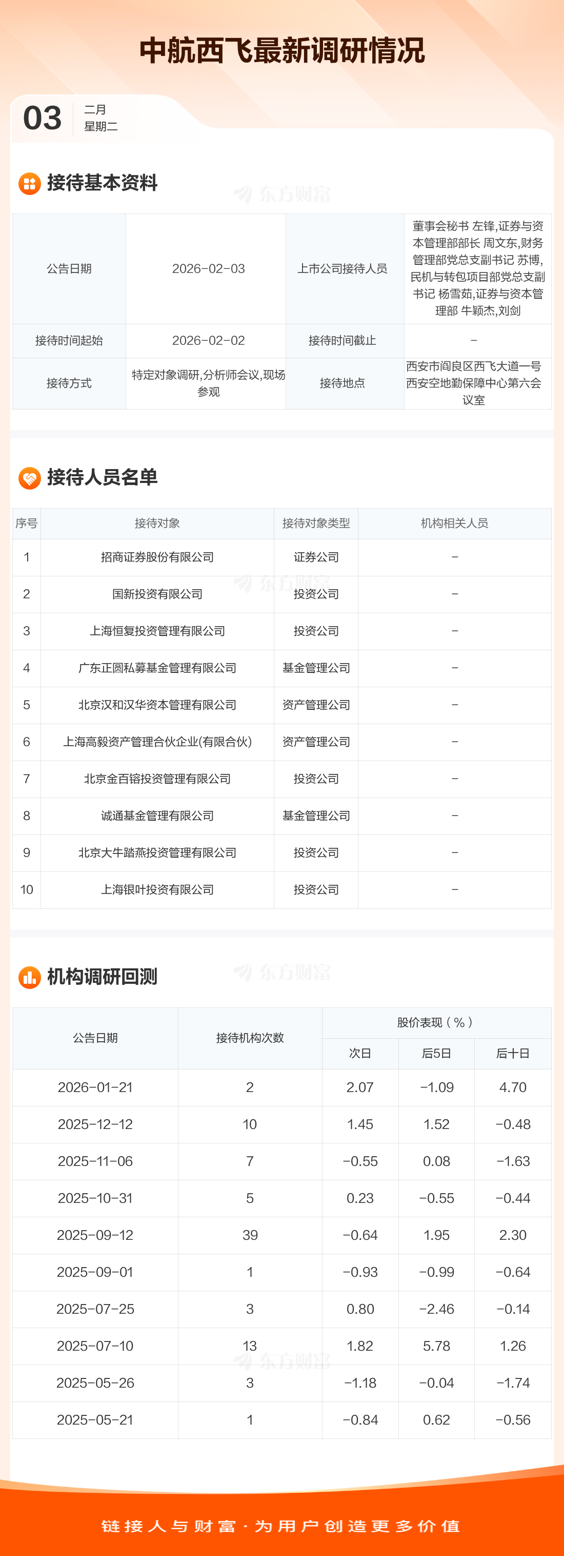 中航西飞2月3日公告称,2月2日接待招商证券股份有限公司等10家机构调研。接待人员包括董事会秘书 左锋,证券与资本管理部部长 周文东,财务管理部党总支副书记 苏博,民机与转包项目部党总支副书记 杨雪茹,证券与资本管理部 牛颖杰,刘剑。