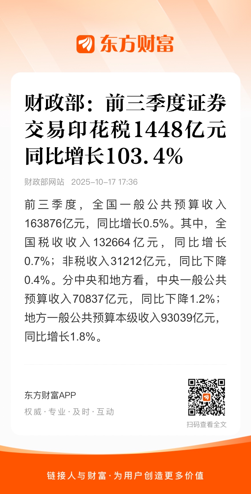 9.印花税3142亿元,同比增长34.5%。其中,证券交易印花税1448亿元,同比增长103.4%。