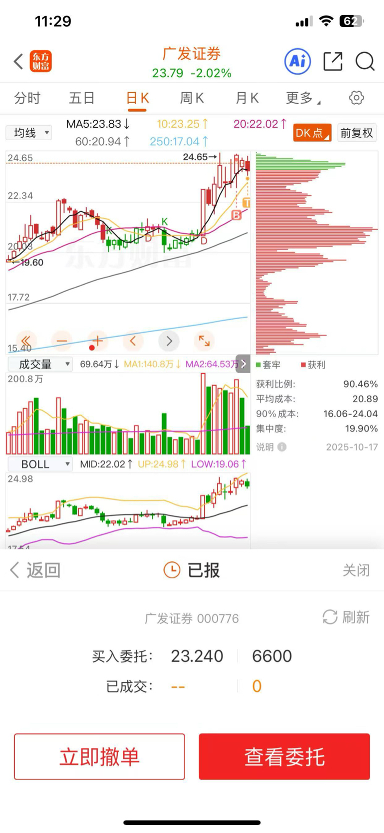 $广发证券(SZ000776)$ 意料之中的回踩 中午休息的时候在支撑位又挂单加仓了15个 目前来说高位筹码持续集中 风险还是大 只能不断做高抛低吸了