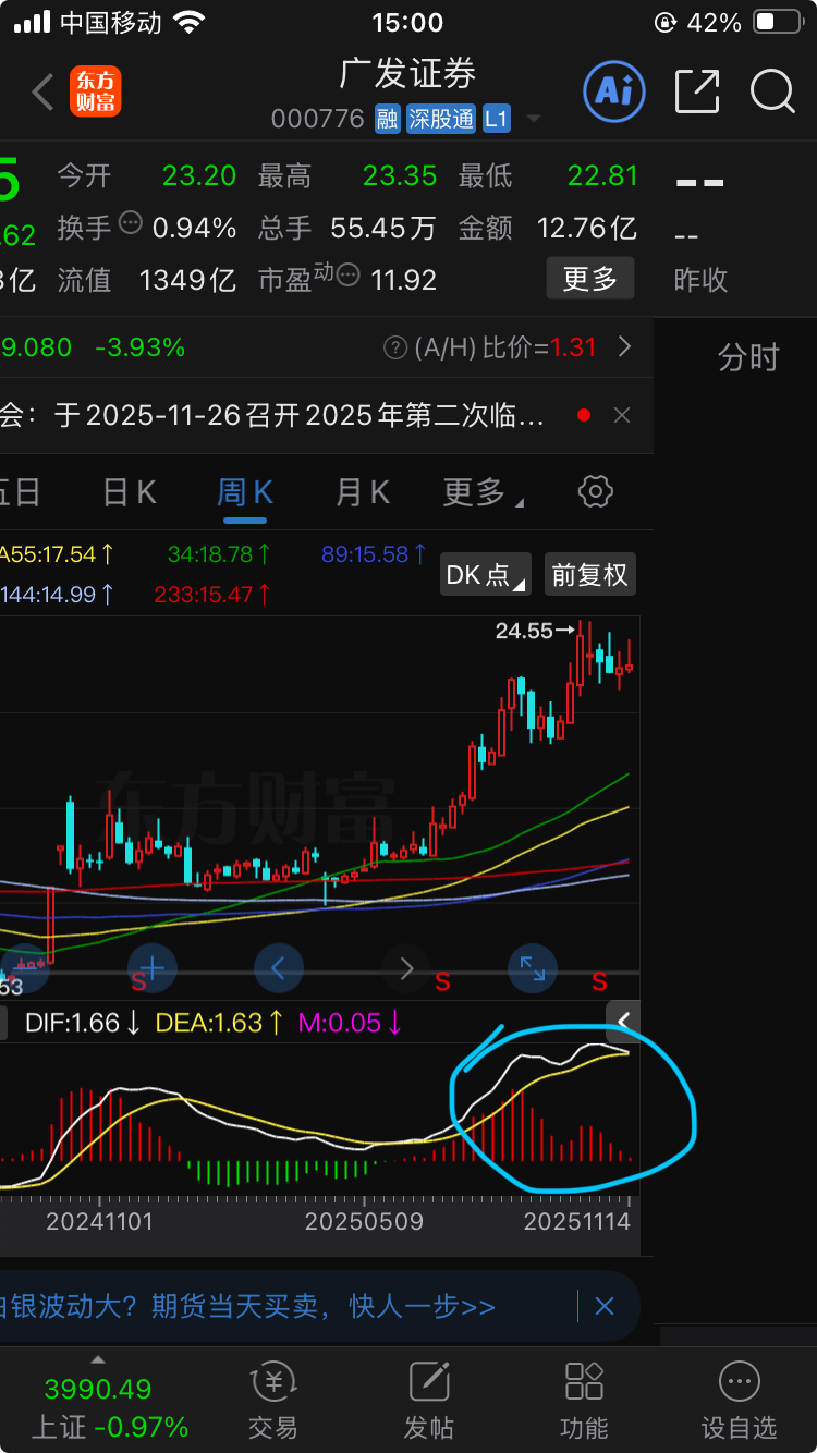 $广发证券(SZ000776)$ 建议阶段性地了结不做证券股了——广发周线图上看,这是最确定的顶部形态。后续即使不大跌,也会先跌一块后转较长时间的横向偏弱震荡,下方出一片绿柱区才能消化。