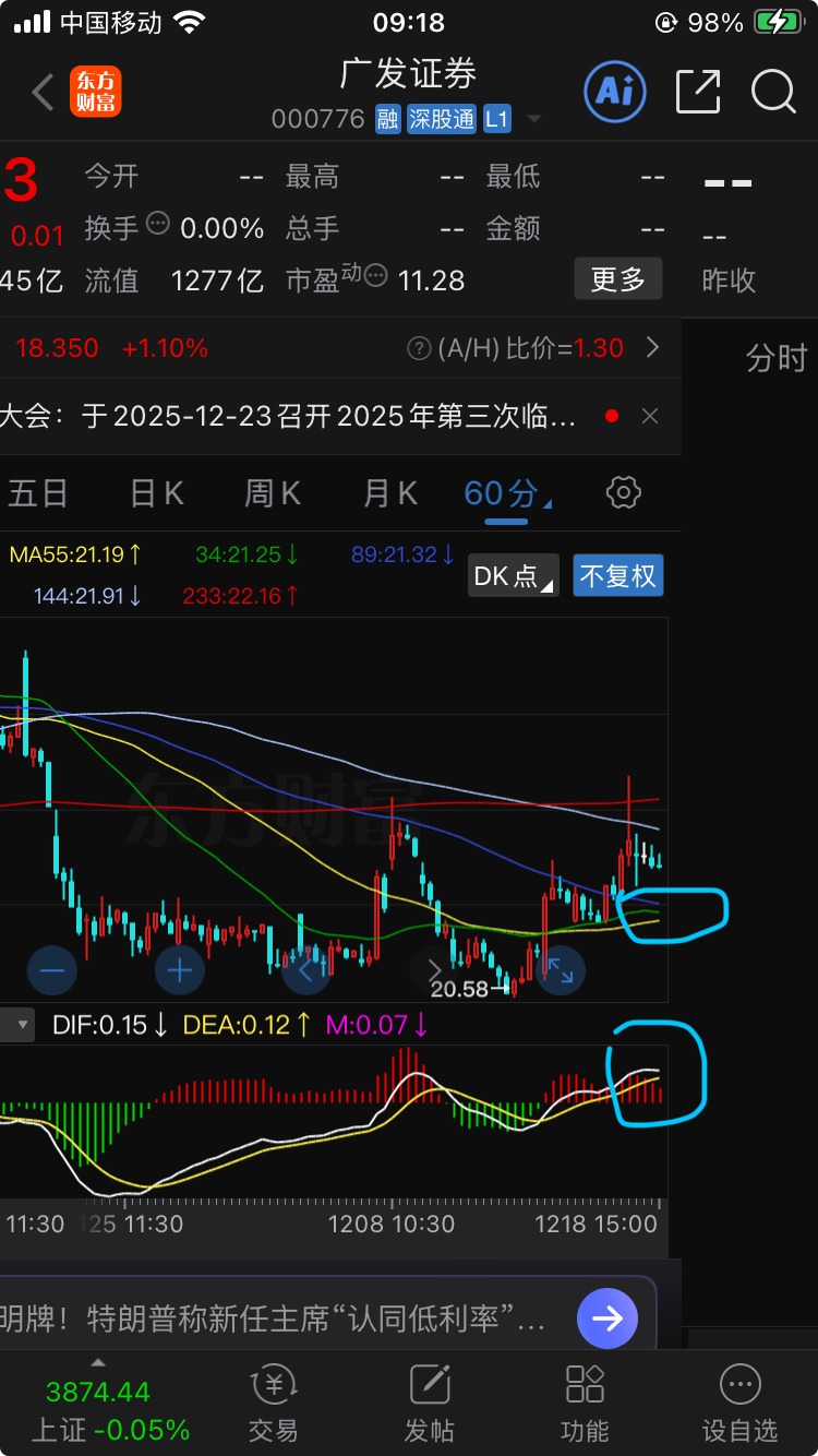 $广发证券(SZ000776)$ 前天晚上传出1.5万亿入市的小作文,昨天没有被证实消息。但今年的减持总金额加上交易税费超过1万亿一定能兑现。股市失血严重,导致“金融消费者”如今“牛市”大亏——60分钟级别均线态势及下方macd 看——阶段性地完蛋了