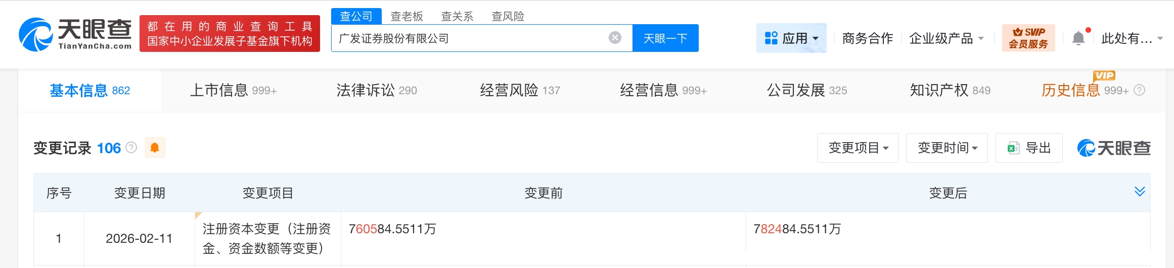南方财经2月13日电,天眼查App显示,近日,广发证券(000776)发生工商变更,注册资本由约76.06亿人民币增至约78.25亿人民币,增幅约3%。广发证券股份有限公司成立于1994年1月,法定代表人为林传辉,经营范围为证券业务、公募证券投资基金销售、证券公司为期货公司提供中间介绍业务、证券投资基金托管。股东信息显示,该公司由香港中央结算(代理人)有限公司、吉林敖东(000623)、辽宁成大(600739)等共同持股。