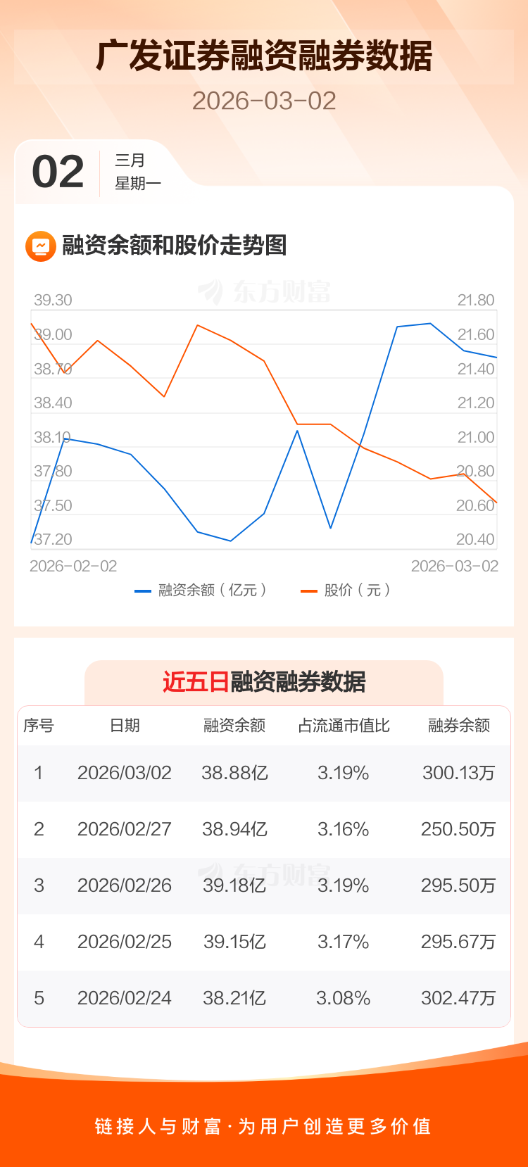 交易所最新数据显示,广发证券于2026年3月2日获融资买入1.06亿元,融资偿还1.12亿元,当日融资净偿还597.57万元。目前,该股融资余额38.88亿,占流通市值比例为3.19%。