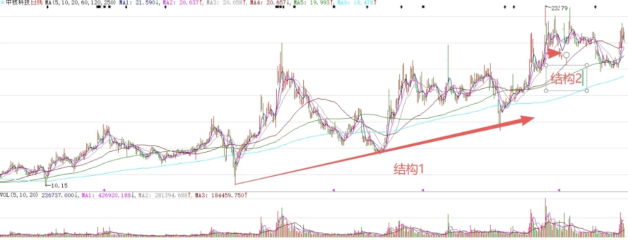 图中标注的大型结构1突破,意味着股价处在比较大的上涨趋势。结构2突破,意味着后期有波段上涨。阶段性底部突破,意味着波段上涨已经开始。所以,调整是暂时的!
