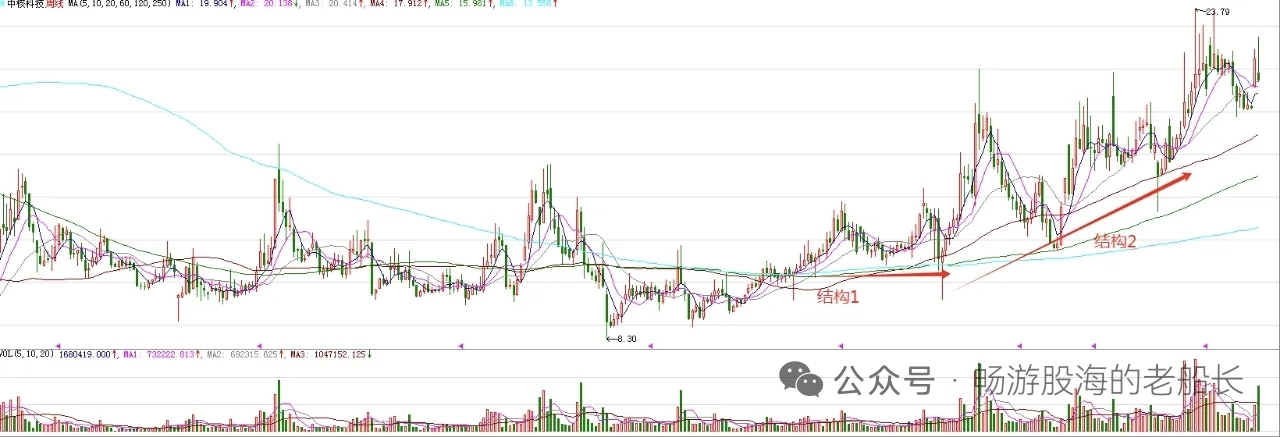 中核科技,周线级别的走势来看,上周的中阳线,站上了三条中短期均线系统,意味着周线级别的阶段性低点得到了确认。本周冲高回落,是底部突破后的回踩是正常的调整,接下来的调整,幅度不大。图中标注的结构1突破,意味着股价处在上涨趋势。结构2是结构1突破后的回踩,意味着后期有波段上涨。短暂调整之后,波段上涨还会继续。