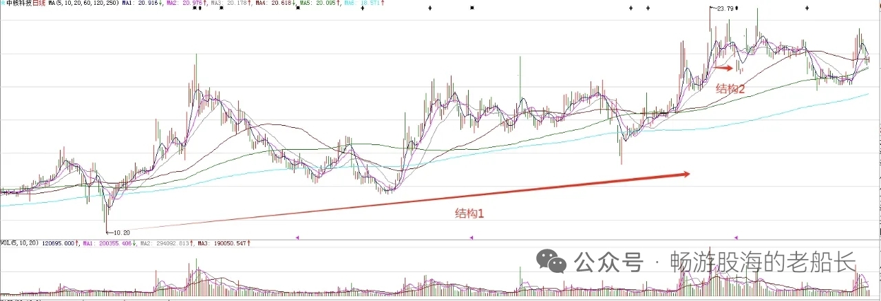 今天小幅度上涨,符合预期。周期面来看,今天是有效上涨的第九个周期,到了变盘节点,今天又走出了企稳型K线,所以,周三股价大概率继续上涨。最近的调整,就是为了等均线走上来,所以,很容易加速上涨。图中标注的大型中枢结构突破,意味着股价处在比较大的波段上涨。结构2突破,意味着后期后波段上涨。接下来,股价还会继续波段上涨。