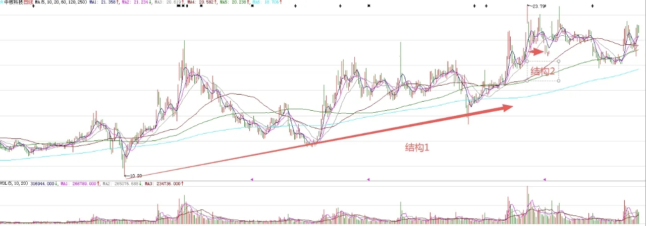 今天小幅度震荡调整,基本符合预期。周二,股价还有小幅度震荡,但是随时会结束调整。这个过程中,三条中短期均线继续得到有效修复。图中标注的大型结构1突破,意味着股价处在比较大的上涨趋势。结构2突破,意味着后期有波段上涨。目前,波段上涨已经在进行中。所以,波段上涨随时会继续。