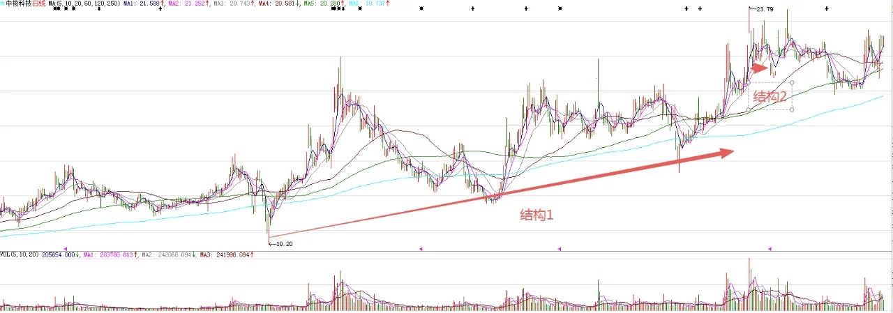 几天呢冲高回落,小幅度调整,基本符合预期。收盘来看,今天的K线,走得比较好,释放了企稳信号。周期面来看,今天是第四个有效周期,到了变盘节点,所以,周三股价大概率结束调整,继续上涨。图中标注的大型结构1突破,意味着股价处在比较大的上涨趋势。结构2突破,意味着后期有波段上涨。现在,波段上涨已经开了个头,接下来还会继续波段上涨。