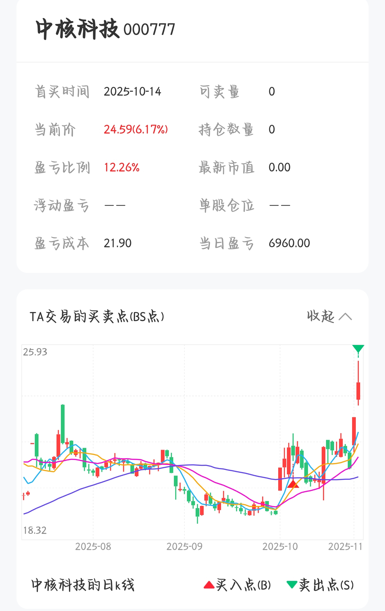#炒股日记# #复盘记录# #投资随笔# 十月中旬买入的中核科技 但是买入价还蛮高的 今天看见涨停就直接卖出了 毕竟待了快一个月好多天都是绿色 还是买入点太高 但是不确定后续会不会继续有涨幅$中核科技(SZ000777)$ 有持有同股的股友发表见解吗