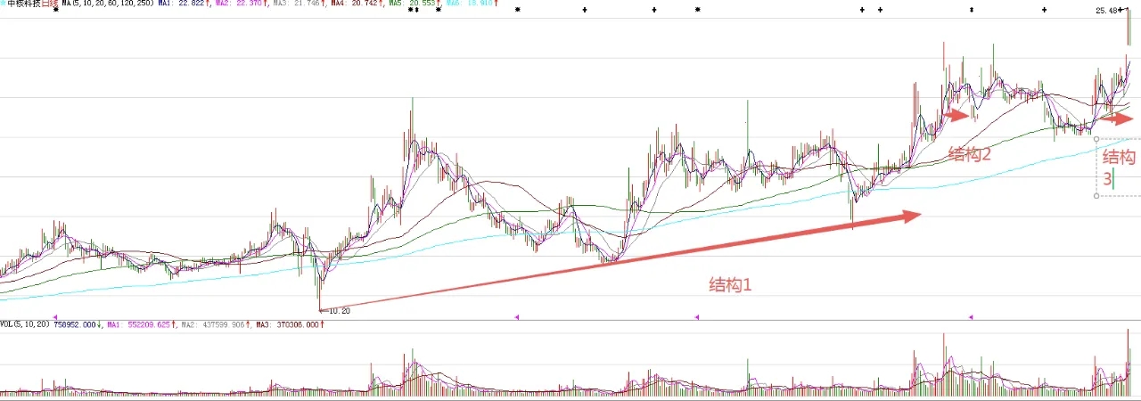 今天冲高回落,继续宽幅震荡。这个位置,就需要筹码充分换手,最近两个交易日的成交量比较活跃,是筹码换手充分的信号。既然图中标注的结构3突破了,股价就进入到主升浪阶段,所以,调整随时会结束。图中标注的大型结构1突破,意味着股价处在比较大的上涨趋势。结构2突破,意味着后期有波段上涨。结构3的突破,意味着波段上涨确立。接下来,股价还会继续波段上涨。