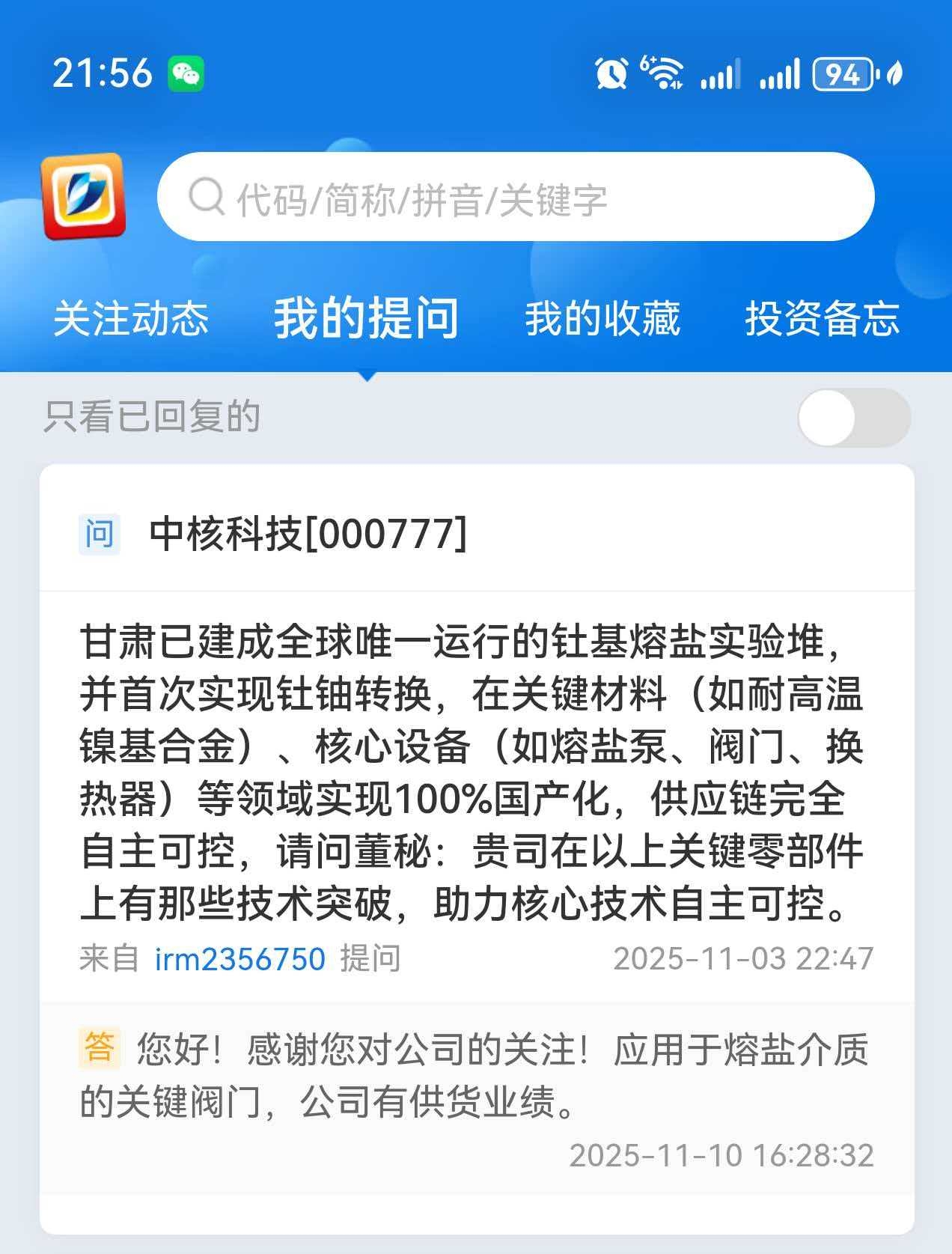 $中核科技(SZ000777)$ 董秘真的是回复的太慢了吧,我10月3日就提问了
