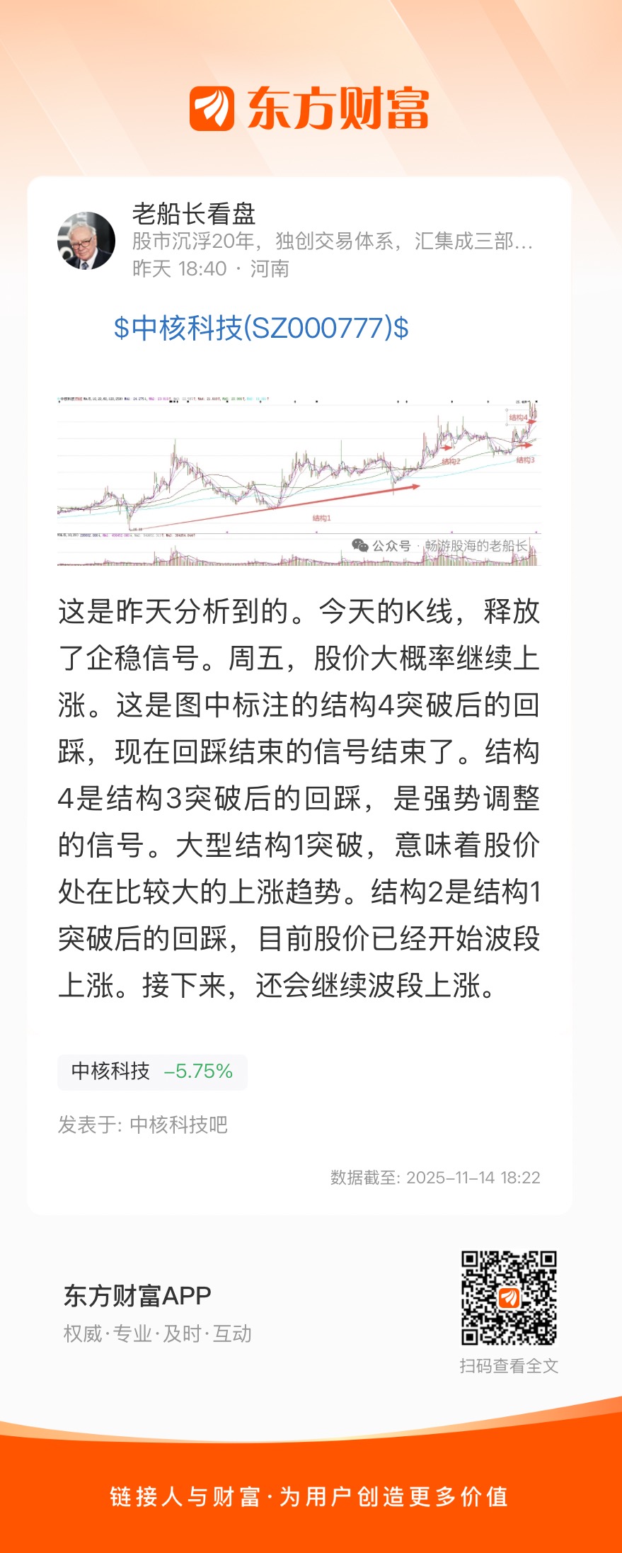 这是昨天分析到的。今天的K线,释放了企稳信号。周五,股价大概率继续上涨。这是图中标注的结构4突破后的回踩,现在回踩结束的信号结束了。结构4是结构3突破后的回踩,是强势调整的信号。大型结构1突破,意味着股价处在比较大的上涨趋势。结构2是结构1突破后的回踩,目前股价已经开始波段上涨。接下来,还会继续波段上涨。