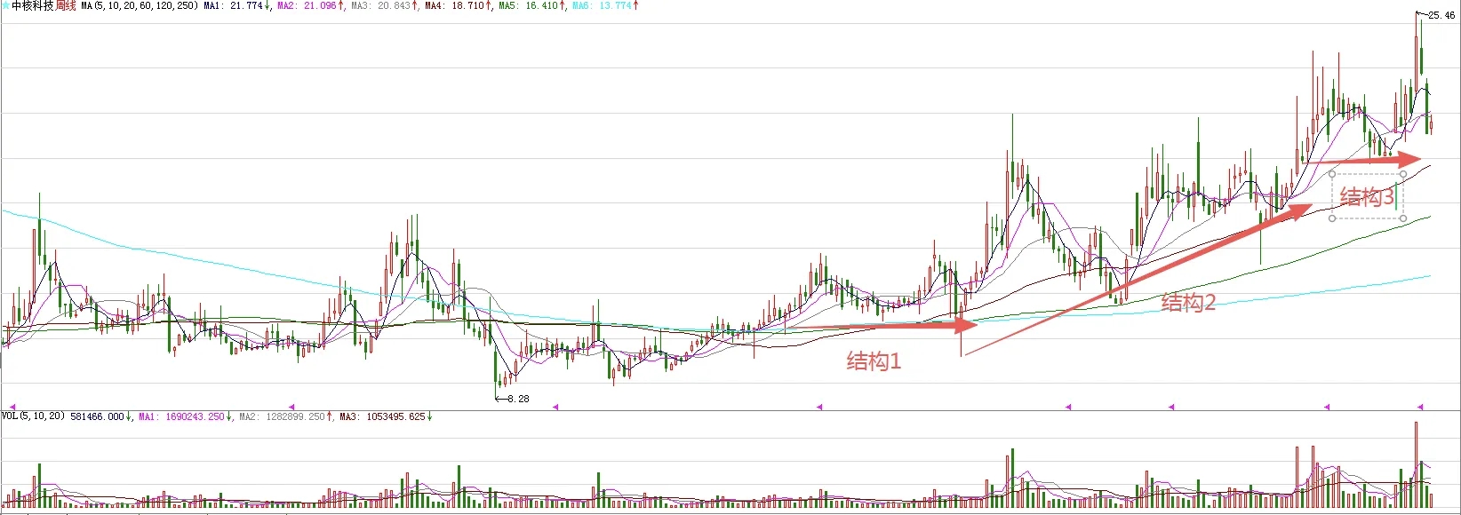 周线级别的走势来看,最近两周调整,幅度比较明显,速度比较快。周期面来看,到本质为止,走了八个有效的周期,下周就是变盘节点了。本周的K线,也是释放了企稳信号。所以,中期调整大概率要结束了。图中标注的结构1突破,意味着股价处在上涨趋势。结构2是结构1突破后的回踩,意味着后期有波段上涨。结构3突破,则是新的波段上涨拉开帷幕的信号。所以,接下来,股价大概率继续波段上涨。