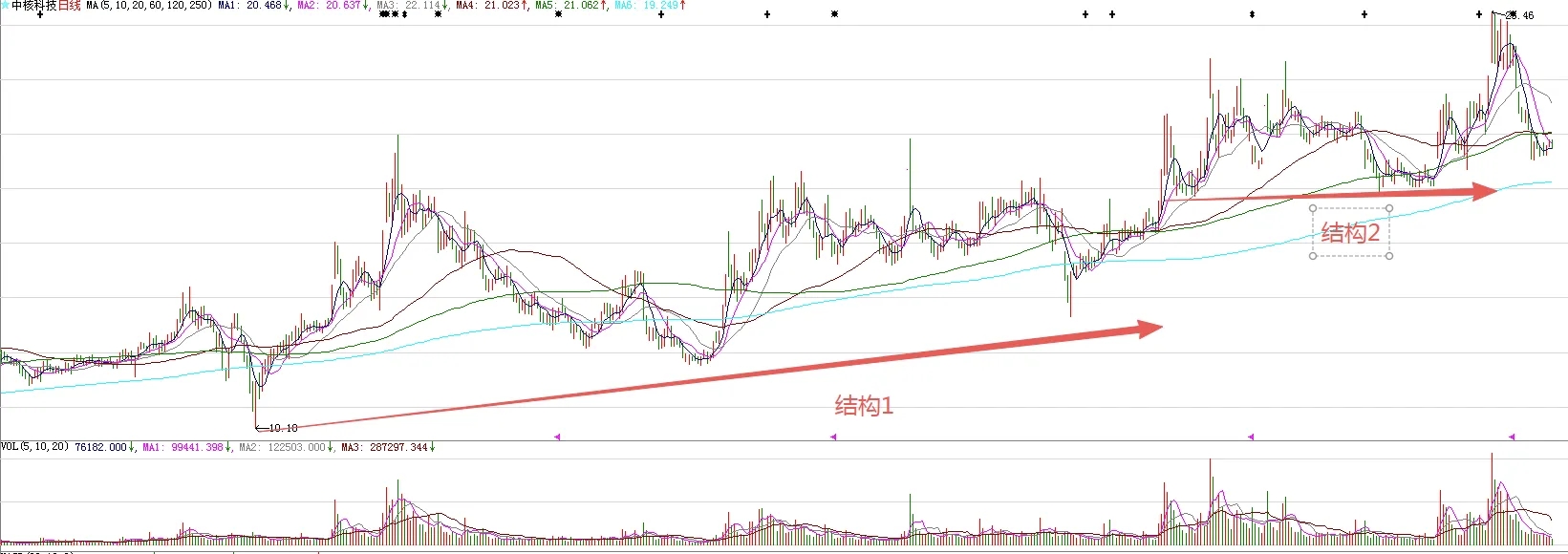 日线级别的走势来看,今天高开低走,小幅度调整。短线来看,周三股价大概率还有调整。接下来的调整,预计在近期低点上方震荡,继续构筑阶段性底部形态,等二十日均线走下来。图中标注的大型结构1突破,意味着股价处在比较大的上涨趋势。结构2是结构1突破后的回踩,意味着后期有波段上涨。这波调整,大概率是下一个波段开始前最后一段调整了。