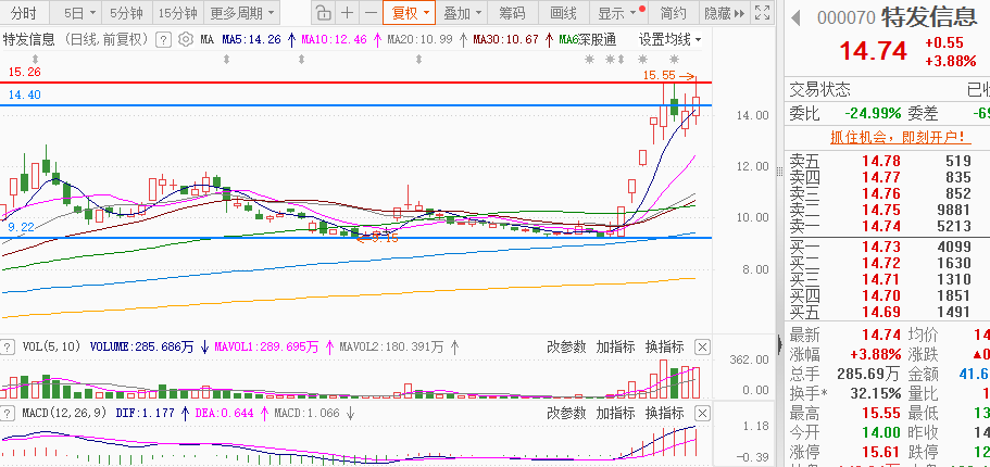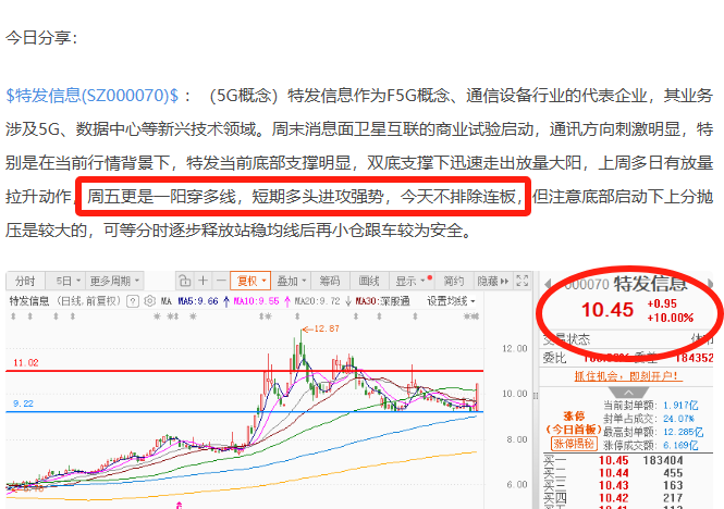 目前特发信息实锤谷歌AI算力供应链,作为谷歌MPO多光纤连接器的核心供应商,近期市场辨识度极高,前面八哥首板做个分享,同时叠加东数西算的政策红利,股价一路高歌猛进,近期两个交易日股价回踩5日线支撑,昨天更是向上试探走出新高,量能保持着随时进攻状态,今天有望加速突破走出新高,早上可等回踩分时逐步跟车。