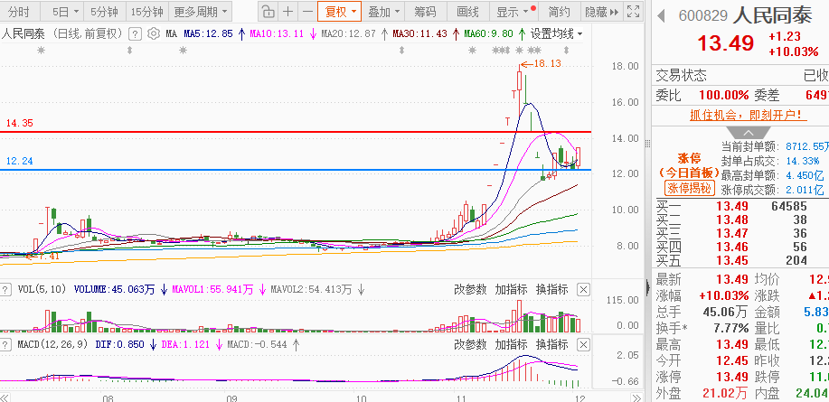 $人民同泰(SH600829)$:(抗流感)近期随着流感的影响下,医药方向来回持续发酵,前面八哥带朋友们吃了波特一药业,目前相对低位可关注的八哥中意人民同泰,公司国内知名药品流通龙头,专业优质服务树立医药商业领导品牌,全国排名领先。目前高位调整底部支撑明显,昨天二次低位涨停,明显给到短期加速反弹信号,逢缺必补,上分还是有较大空间的,今天早盘分时下方可小仓博弈。