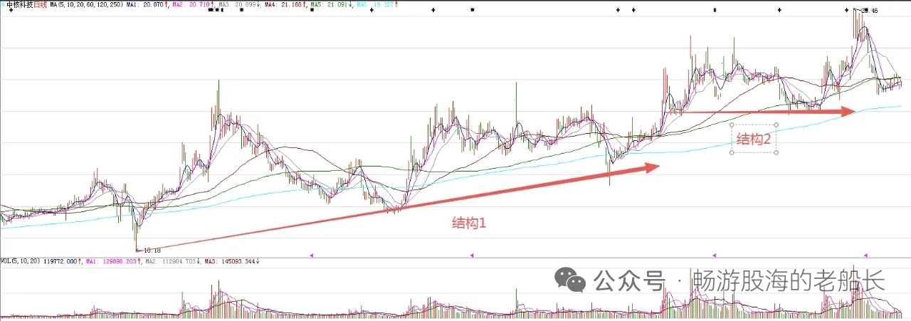 小幅度上涨,日K线上影线比较长,和昨天的K线结合一起,构成了企稳型组合。日线级别的二十日均线已经充分走下来,靠近两条短期均线,修复效果良好,股价已经没有必要继续深幅度调整。所以,这里大概率会结束中期调整。图中标注的大型结构1突破,意味着股价处在大型上涨趋势。结构2是结构1突破后的回踩,意味着后期有波段上涨。股价,距离波段上涨不远了。