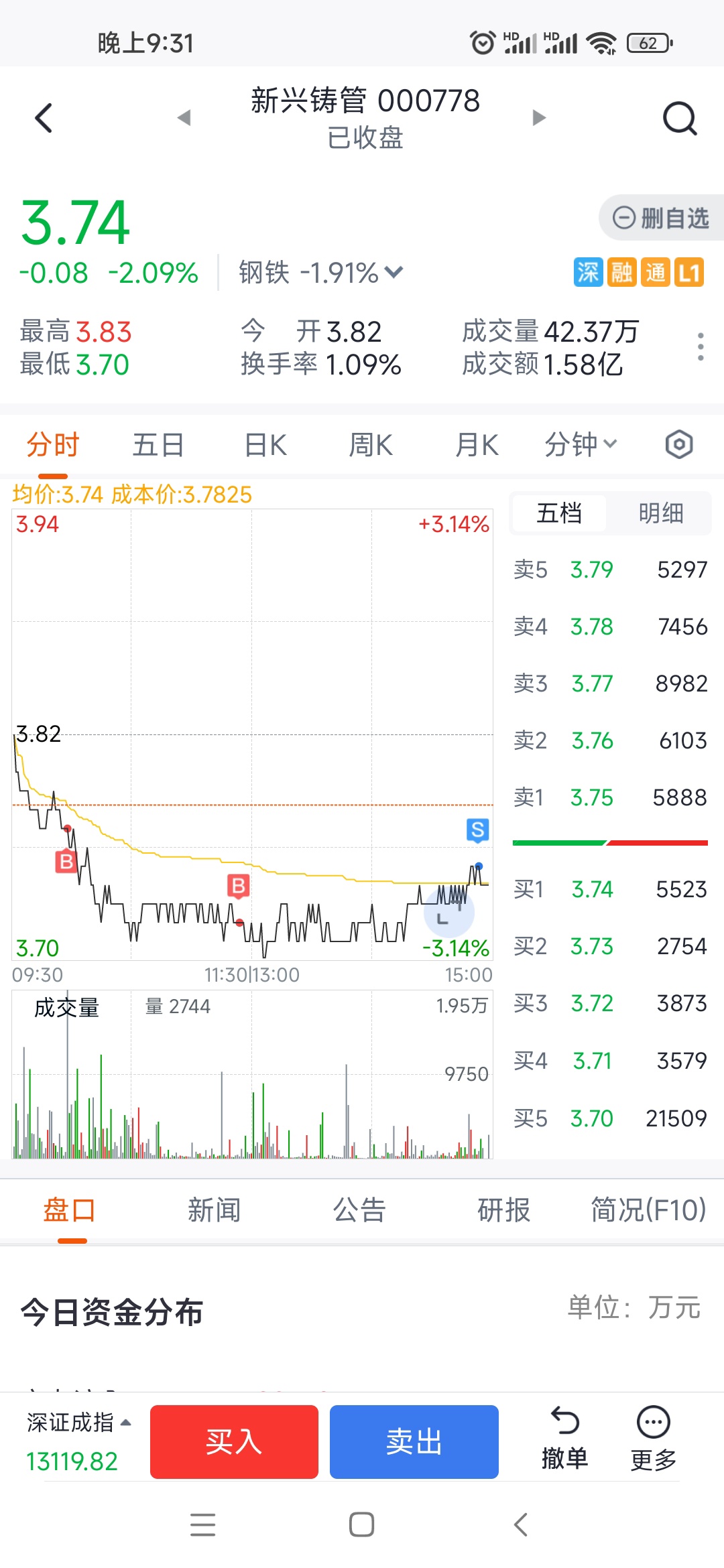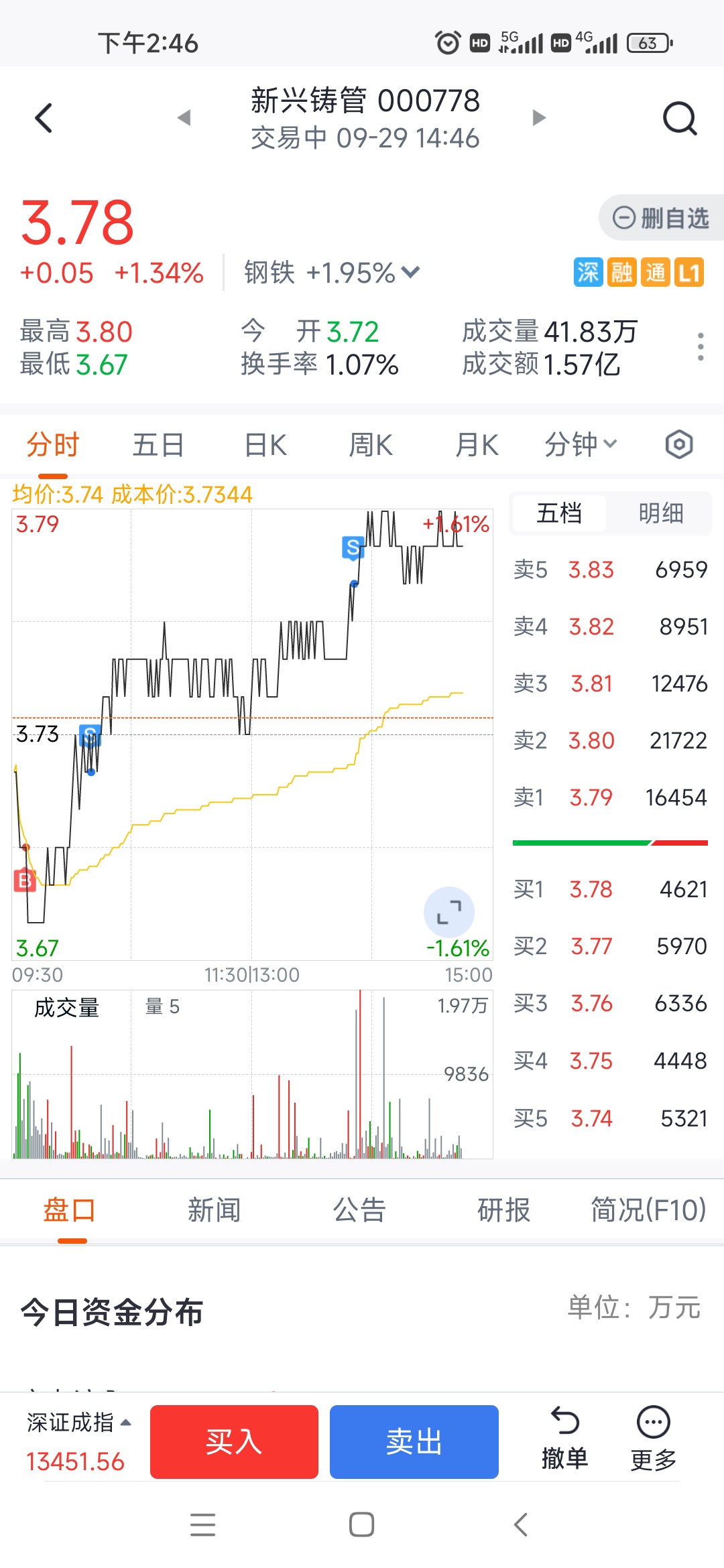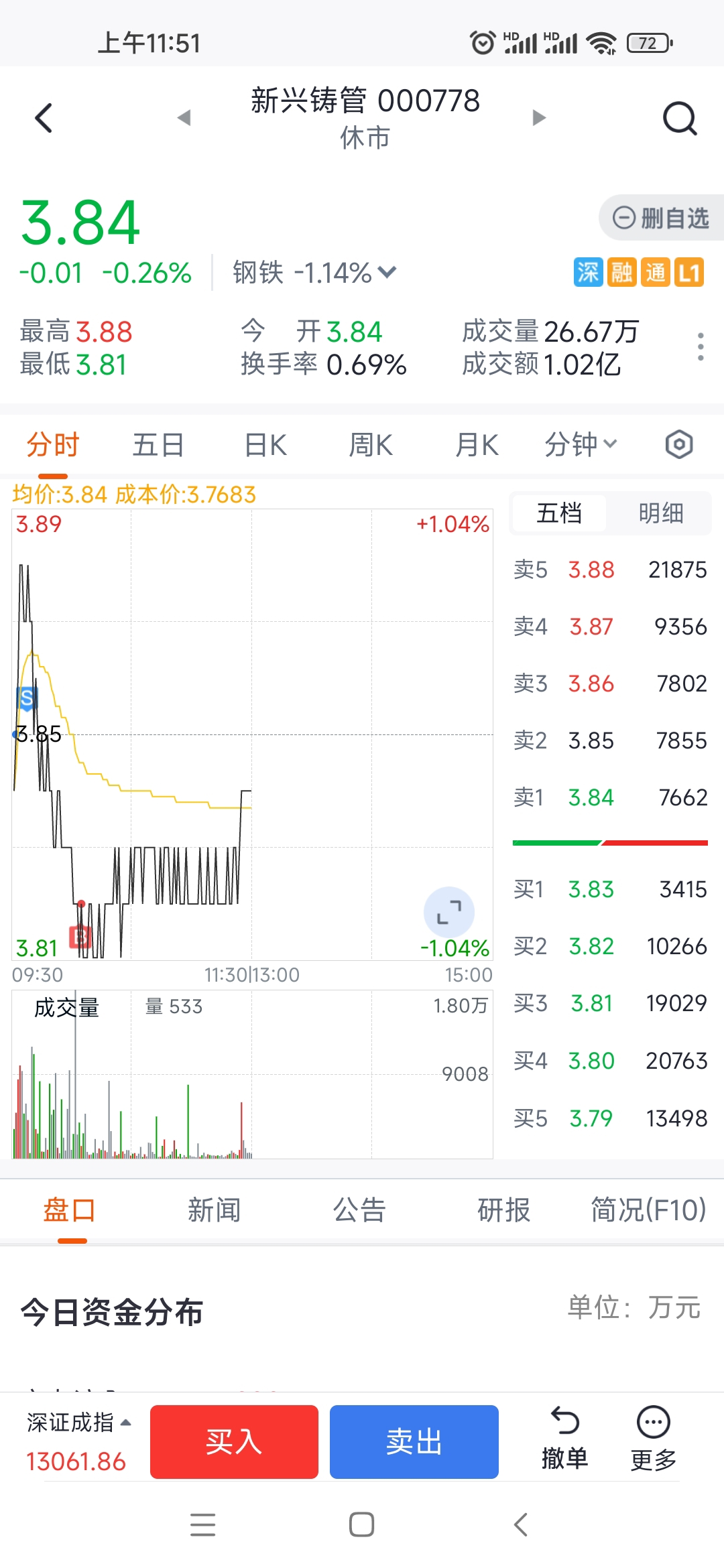 早起5点多就挂的3.84卖,结果没成交。买盘还是太弱大家都在等它跌,我也在等它跌,下一个价位3.7左右进第二成仓,一定要下来呀!