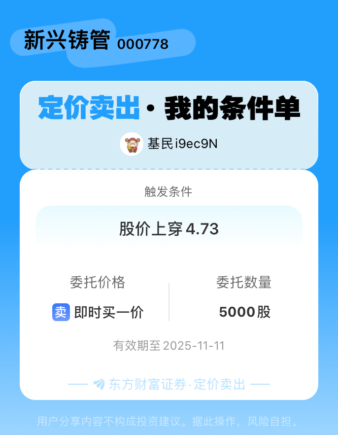 #条件单交流# #定价卖出晒单# 一位股神设置了一个定价卖出条件单,接下来就是见证奇迹的时刻~$新兴铸管(SZ000778)$