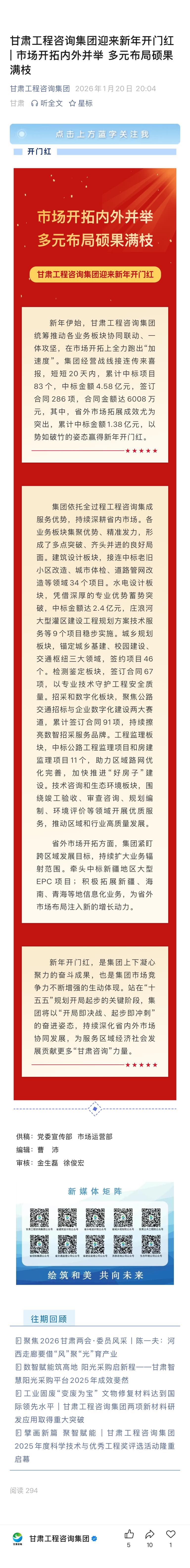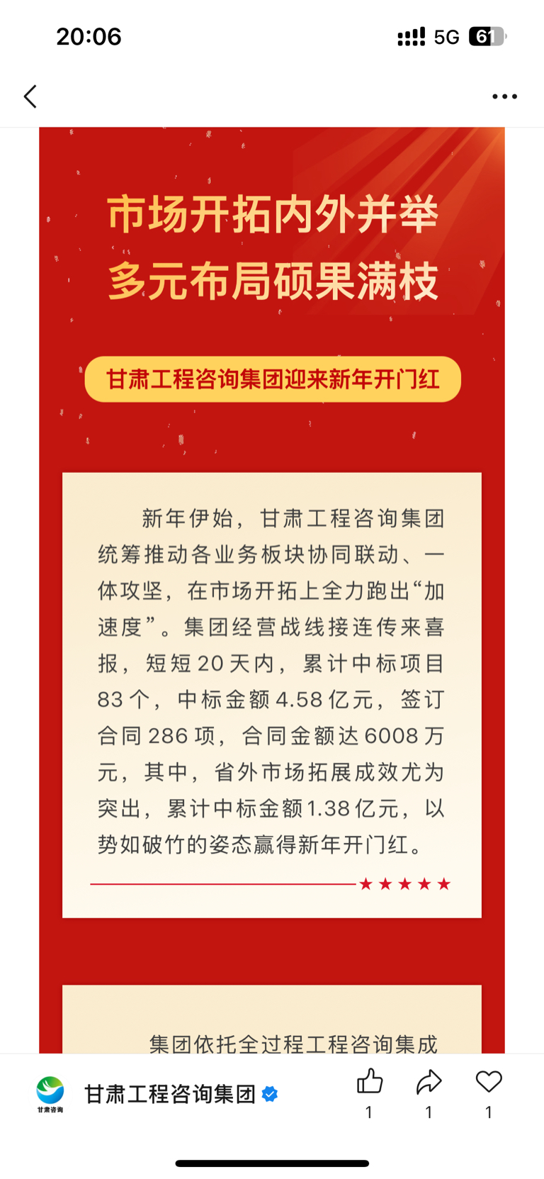 新年伊始,甘肃工程咨询集团统筹推动各业务板块协同联动、一体攻坚,在市场开拓上全力跑出“加速度”。集团经营战线接连传来喜报,短短20天内,累计中标项目83个,中标金额4.58亿元,签订合同286项,合同金额达6008万元,其中,省外市场拓展成效尤为突出,累计中标金额1.38亿元,以势如破竹的姿态赢得新年开门红。