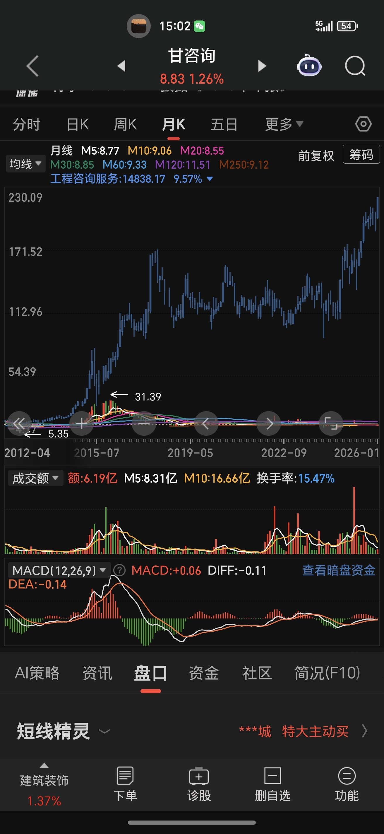 图中蓝色K线是工程咨询服务板块的K线,下面趴着的是甘咨询K线,工程咨询服务板块已