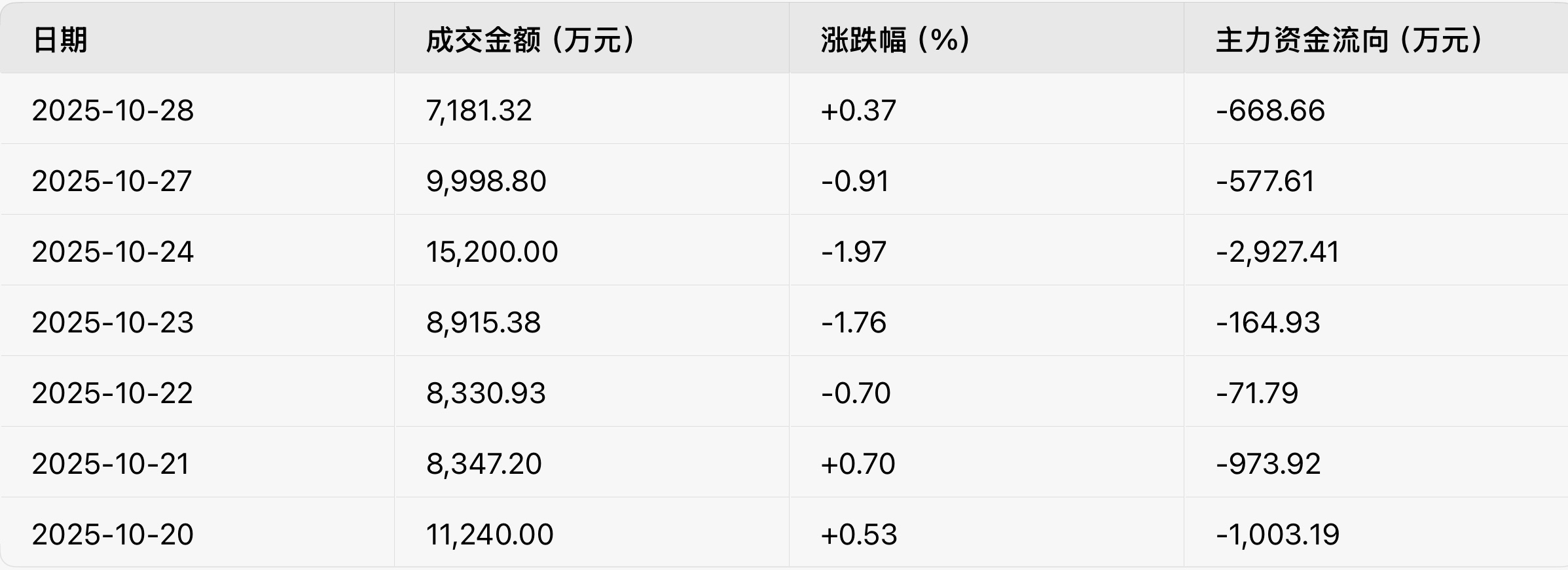 近7个交易日主力资金累计净流出超6,000万元,机构投资者短期减持意愿较强,散户资金呈现被动承接特征