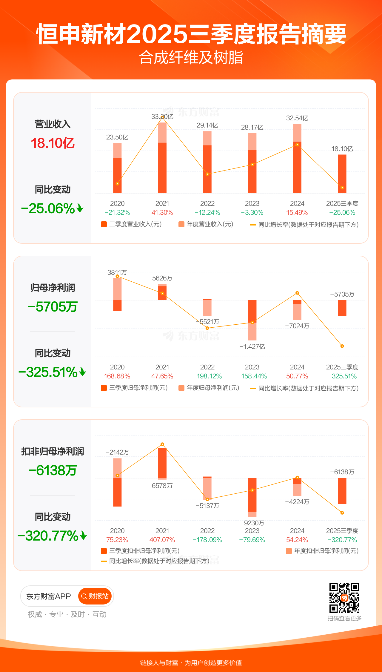 恒申新材10月30日发布2025年三季报显示,公司前三季实现营业收入18.10亿元,同比下滑25.06%;归母净利润-5704.91万元;扣非归母净利润-6137.52万元。