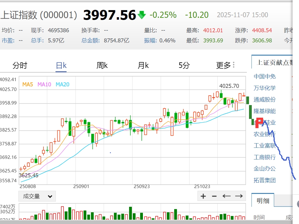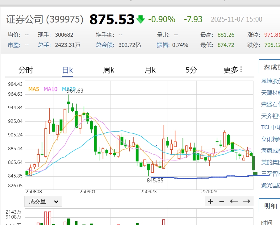 $证券(BK0473)$ 别了4000点,昨天下午尾盘证券很多股票都出现了疯狂跳水,证明妈妈对做多意愿不强,也不太愿意做一个上攻,今年的点位高点就在4025.7,日k线4000得而复失,而且来连续几次,我们经常说一而衰,二而竭,三而溃,再加之到年底,资金面偏紧,很多散户游资都慢慢撤出股市,股市也将迎来大面积的回调,个人预测,证券带领大盘回到3700点附近做一个震荡为2026年蓄势,那么我们散户朋友要慢慢的收回自己,做一个防守策略,证券板块是风向标,证券所以有的个股都是在走边打边撤的战术,大家可以去看他们的日k线,所以必须空仓或者清仓等待,或者用自己的利润小玩下,无伤大雅,警惕调整带来的亏损!我个人预测明年的二会前摸4000点!只要你们有耐心!年底可以适当关注大消费板块$湘财股份(SH600095)$ $东北证券(SZ000686)$